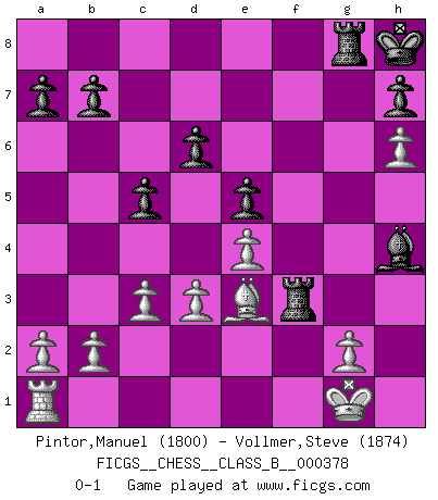 Last move : 0-1 2024 October 8 3:49:26 [Event "FICGS__CHESS__CLASS_B__000378"] [Site "FICGS"] [Date "2024.09.08"] [Round "1"] [White "Pintor,Manuel"] [Black "Vollmer,Steve"] [Result "0-1"] [WhiteElo "1800"] [BlackElo "1874"] 1.e4 Nf6 2.Nc3 d6 3.f4 Nc6 4.Nf3 Bg4 5.Bc4 e5 6.O-O Be7 7.d3 Qd7 8.Nd5 Nxd5 9.Bxd5 O-O 10.c3 Bf6 11.Qb3 Nd8 12.f5 Bxf3 13.Rxf3 c6 14.Bxf7+ Qxf7 15.Qd1 c5 16.Rg3 Nc6 17.h4 Ne7 18.h5 Kh8 19.h6 g6 20.fxg6 Nxg6 21.Qg4 Rg8 22.Qh5 Raf8 23.Rf3 Nh4 24.Qxh4 Bxh4 25.Rxf7 Rxf7 26.Be3 Rf3 0-1 Follow this game move after move (download)The beauty of a move lies not in its' appearance but in the thought behind it. (Siegbert Tarrasch) Rauchen ist dem Schachspieler bei seiner Arbeit, also im Wettkampf, untersagt. (Viktor Kortschnoi) Fischer es el jugador mas fuerte del mundo. De hecho, el jugador mas fuerte que jamas haya existido. (Larry Evans) La tactique est l'élément le plus important du milieu de jeu. (Siegbert Tarrasch) To be champion requires more than simply being a strong player; one has to be a strong human being as well. (Anatoly Karpov)