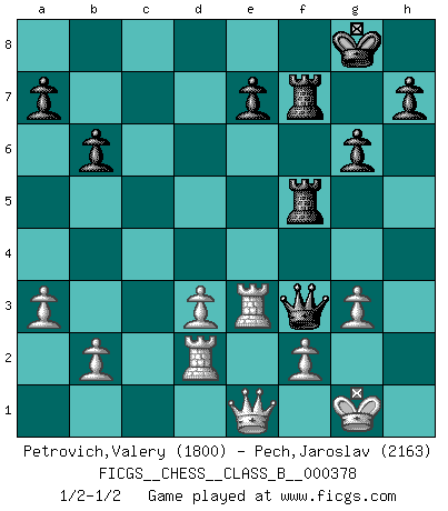 Last move : 1/2-1/2 2025 April 20 12:31:46 [Event "FICGS__CHESS__CLASS_B__000378"] [Site "FICGS"] [Date "2024.09.08"] [Round "1"] [White "Petrovich,Valery"] [Black "Pech,Jaroslav"] [Result "1/2-1/2"] [WhiteElo "1800"] [BlackElo "2163"] 1.Nf3 Nf6 2.c4 c5 3.Nc3 Nc6 4.g3 d5 5.cxd5 Nxd5 6.Bg2 Nc7 7.a3 g6 8.h4 Bg4 9.Qb3 Qc8 10.Ng5 Ne6 11.Qa4 Nxg5 12.hxg5 Bd7 13.Qf4 Bg7 14.d3 Nd4 15.Rb1 Ne6 16.Qh4 Bc6 17.Kf1 Qd7 18.Bxc6 Qxc6 19.Be3 Bd4 20.Bxd4 cxd4 21.Ne4 Qc2 22.Kg2 Qxe2 23.Nc5 Qd2 24.Nxe6 fxe6 25.Rhd1 Qa5 26.Qxd4 O-O 27.Qe4 Qxg5 28.Qxe6+ Rf7 29.Rbc1 Qf6 30.Qe2 Rd8 31.Rc4 Rd5 32.Rd2 Rf5 33.Qe3 b6 34.Re4 Rf3 35.Qe1 Qc6 36.Kg1 R3f5 37.Re6 Qf3 38.Re3 1/2-1/2 Follow this game move after move (download)A sacrifice is best refuted by accepting it. (Wilhelm Steinitz) Modernes Schach sorgt sich zuviel um Dinge wie Bauernstruktur usw. Vergessen Sie das, Schachmatt beendet das Spiel! (Nigel Short) Los errores estan ahí, esperando a que se cometan. (Savielly Tartakower) Ce qui est bien, c'est d'avoir tout un tas de pièces en prise : l'adversaire ne peut en prendre qu'une à la fois. Cité par Thierry Audin. Hardware: the parts of a computer that can be kicked. (Jeff Persis)