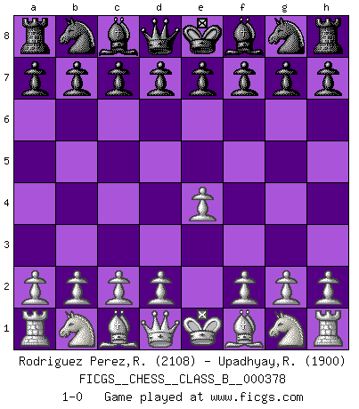 Last move : 1-0 2024 October 19 11:45:13 [Event "FICGS__CHESS__CLASS_B__000378"] [Site "FICGS"] [Date "2024.09.08"] [Round "1"] [White "Rodriguez Perez,Rene"] [Black "Upadhyay,Rajesh"] [Result "1-0"] [WhiteElo "2108"] [BlackElo "1900"] 1.e4 1-0 This chess game has been lost on time (started : 2024.09.08 22:59:28) Follow this game move after move (download)Tactics flow from a superior position. (Bobby Fischer) Stil? Ich habe keinen Stil! (Anatoly Karpov) El Ajedrez, como cualquier actividad creativa, solo puede existir a través del esfuerzo combinado de aquellos que tienen talento creativo y de aquellos que poseen la habilidad de organizar su trabajo creativo. (Mikhail Botvinnik) Un millionnaire : 'Monsieur Steinitz ! Vous ne participez aux tournois que pour l'argent, alors que moi je n'y viens que pour l'honneur.' Steinitz : 'Chacun joue pour ce qu'il n'a pas'... Luck never made a man wise. (Seneca, Letters to Lucilius)