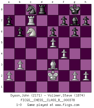 Last move : 1-0 2024 October 27 11:48:31 [Event "FICGS__CHESS__CLASS_B__000378"] [Site "FICGS"] [Date "2024.09.08"] [Round "1"] [White "Dyson,John"] [Black "Vollmer,Steve"] [Result "1-0"] [WhiteElo "2171"] [BlackElo "1874"] 1.e4 Nf6 2.e5 Nd5 3.d4 d6 4.c4 Nb6 5.f4 g6 6.Nc3 Bg7 7.Be3 dxe5 8.dxe5 Qxd1+ 9.Rxd1 Nc6 10.Nb5 O-O 11.Nxc7 Rb8 12.b3 Bf5 13.Bd3 Bxd3 14.Rxd3 Nb4 15.Rd2 Rfd8 16.Nf3 Rxd2 17.Kxd2 Rd8+ 18.Ke2 Nc8 19.Nd5 Nxd5 20.cxd5 Rxd5 21.Rc1 Rd8 22.Rc7 b6 23.Nd4 e6 24.Nc6 1-0 Follow this game move after move (download)Every Chess master was once a beginner. (Chernev) Frage: Gibt es etwas was Sie mehr lieben als Autobahnen ohne Tempobegrenzungen? - Antwort: Deutsche Frauen ohne Tempobegrenzungen. (Loek van Wely) Bobby es el jugador de Ajedrez mas fino que este país jamás haya producido. Su memoria para las movidas, su brillantez en soñar combinaciones y su feróz determinación por la victoria son algo extraño. (John Collins) Mais n'est-ce pas déjà le limiter injurieusement que d'appeler les échecs un jeu? N'est-ce pas aussi une science, un art, ou quelque chose qui, comme le cercueil de Mahomet entre ciel et terre, est suspendu entre l'un et l'autre, et qui réunit un nombre incroyable de contraires ? (Stefan Zweig) Don't be irreplaceable, if you can't be replaced, you can't be promoted. (Dan Rotaru)