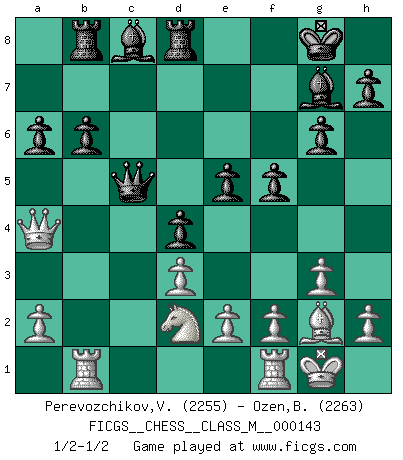Last move : 1/2-1/2 2024 September 26 1:9:5 [Event "FICGS__CHESS__CLASS_M__000143"] [Site "FICGS"] [Date "2024.09.16"] [Round "1"] [White "Perevozchikov,Vjacheslav"] [Black "Ozen,Bahadir"] [Result "1/2-1/2"] [WhiteElo "2255"] [BlackElo "2263"] 1.Nf3 d5 2.g3 Nf6 3.Bg2 c5 4.O-O g6 5.b3 Bg7 6.Bb2 O-O 7.c4 d4 8.b4 Re8 9.d3 e5 10.bxc5 Na6 11.Nbd2 Nxc5 12.Ba3 Qc7 13.Bxc5 Qxc5 14.Ng5 Qe7 15.Rb1 Rd8 16.Nge4 Nd7 17.Qb3 Rb8 18.Qa4 a6 19.Nb3 f5 20.Ned2 b6 21.c5 Nxc5 22.Nxc5 Qxc5 1/2-1/2 Follow this game move after move (download)The mistakes are there, waiting to be made. (Savielly Tartakower) Ein Buch ist ein Spiegel; wenn ein Affe hineinsieht, so kann kein Apostel heraus gucken. (Georg Christoph Lichtenberg) Hay jugadores fuertes y personas amables y yo soy un jugador fuerte. (Bobby Fischer) Pour se monter efficace, un Cavalier a besoin d'avant-postes ! Les Cavaliers font les meilleurs bloqueurs de pions passés. Once you start thinking you have nothing left to learn, you have everything to learn. (Steve Badget)
