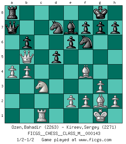 Last move : 1/2-1/2 2024 September 22 22:2:26 [Event "FICGS__CHESS__CLASS_M__000143"] [Site "FICGS"] [Date "2024.09.16"] [Round "1"] [White "Ozen,Bahadir"] [Black "Kireev,Sergey"] [Result "1/2-1/2"] [WhiteElo "2263"] [BlackElo "2271"] 1.d4 Nf6 2.c4 e6 3.Nf3 d5 4.g3 Bb4+ 5.Bd2 Be7 6.Bg2 c6 7.O-O O-O 8.Qc2 b6 9.Ne5 Bb7 10.Bf4 Nbd7 11.Rd1 Nh5 12.Bd2 Nhf6 13.cxd5 cxd5 14.Nc6 Bxc6 15.Qxc6 Rc8 16.Qa4 Rc4 17.Qxa7 Rxd4 18.Nc3 Rc4 19.Rac1 Rc8 20.Qa4 Rc4 21.Qa6 Qb8 22.b3 R4c8 23.Bf4 Nc5 24.Qb5 Qa7 25.b4 Ncd7 26.a4 Rc4 27.Na2 Rxc1 28.Rxc1 Ra8 29.Nc3 1/2-1/2 Follow this game move after move (download)You must take your opponent into a deep dark forest where 2+2=5, and the path leading out is only wide enough for one. (Mikhail Tal) Später, ... hatte ich zunehmend Erfolg in entscheidenden Partien. Vielleicht weil ich eine einfache Wahrheit erkannte: nicht nur ich hatte Angst, auch mein Gegner. (Mikhail Nekhemyevich Tal) En el Ajedrez, tal como en la vida, las bendiciones de hoy pueden ser el veneno del mañana. (Assaic) La vie et les Echecs sont tous les deux une lutte constante. (Lasker) Real knowledge is to know the extent of one's ignorance. (Confucius)