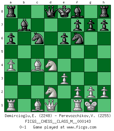 Last move : 0-1 2024 December 10 14:44:18 [Event "FICGS__CHESS__CLASS_M__000143"] [Site "FICGS"] [Date "2024.09.16"] [Round "1"] [White "Demircioglu,Emre"] [Black "Perevozchikov,Vjacheslav"] [Result "0-1"] [WhiteElo "2248"] [BlackElo "2255"] 1.d4 d5 2.c4 dxc4 3.Nf3 a6 4.e3 b5 5.a4 Bb7 6.b3 e6 7.bxc4 bxc4 8.Bxc4 c5 9.O-O Nf6 10.Nbd2 cxd4 11.Nxd4 Nc6 0-1 This chess game has been lost on time (started : 2024.09.16 3:25:43) Follow this game move after move (download)We don't really know how the game was invented, though there are suspicions. As soon as we discover the culprits, we'll let you know. (Bruce Pandolfini) Die jungen Leute sollen verstehen, dass sie noch etwas von mir lernen können und müssen. (Viktor Kortschnoi) Morphy probablemente fue el genio más grande de todos. (Bobby Fischer) Ce qui est bien, c'est d'avoir tout un tas de pièces en prise : l'adversaire ne peut en prendre qu'une à la fois. Cité par Thierry Audin. The question of whether computers can think is just like question of whether submarines can swim. (Edsger W. Dijkstra)
