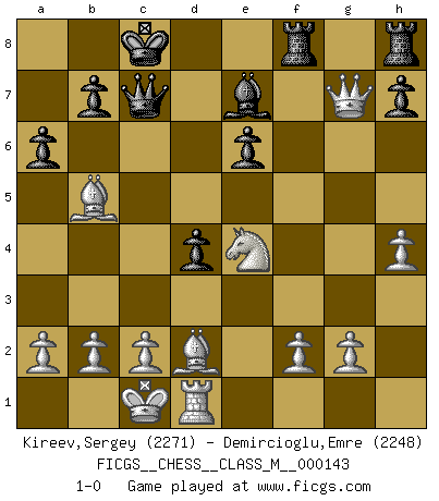Last move : 1-0 2025 January 5 14:19:3 [Event "FICGS__CHESS__CLASS_M__000143"] [Site "FICGS"] [Date "2024.09.16"] [Round "1"] [White "Kireev,Sergey"] [Black "Demircioglu,Emre"] [Result "1-0"] [WhiteElo "2271"] [BlackElo "2248"] 1.e4 e6 2.d4 d5 3.Nc3 dxe4 4.Nxe4 Nd7 5.Nf3 Ngf6 6.Bd3 c5 7.Be3 Qc7 8.Qe2 Nxe4 9.Bxe4 Nf6 10.Bd3 a6 11.h4 Bd7 12.O-O-O Nd5 13.Ng5 Be7 14.Qf3 O-O-O 15.Qxf7 Rdf8 16.Qxg7 Bf6 17.Qh6 cxd4 18.Bd2 Nc3 19.Ne4 Nxd1 20.Rxd1 Be7 21.Qg7 Bb5 22.Bxb5 1-0 Follow this game move after move (download)There are two types of sacrifices: correct ones and mine. (Mikhail Tal) Wie bekannt hörte Morphy 1859 auf, Schach zu spielen. Seine Enttäuschung galt nicht so sehr dem Schach, wie den Schachspielern. (Robert James Fischer) Aquel que teme a un Peón de Reina aislado, debería de retirarse del Ajedrez. (Siegbert Tarrasch) Vouloir jouer aux échecs contre soi-même est aussi paradoxal que vouloir marcher sur son ombre. (Stefan Zweig) May I never be complete. May I never be content. May I never be perfect. Deliver me, Tyler, from being perfect and complete. (Chuck Palahniuk, Fight Club)