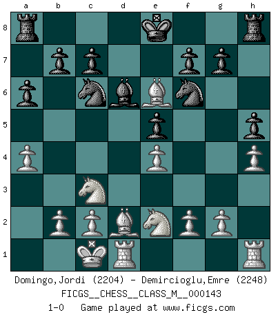 Last move : 1-0 2024 December 10 2:17:48 [Event "FICGS__CHESS__CLASS_M__000143"] [Site "FICGS"] [Date "2024.09.16"] [Round "1"] [White "Domingo,Jordi"] [Black "Demircioglu,Emre"] [Result "1-0"] [WhiteElo "2204"] [BlackElo "2248"] 1.e4 d6 2.d4 Nf6 3.Nc3 e5 4.dxe5 dxe5 5.Qxd8+ Kxd8 6.Bc4 Ke8 7.Bd2 Nc6 8.O-O-O Bd6 9.Nge2 h5 10.h4 a6 11.a4 Be6 12.Bxe6 1-0 This chess game has been lost on time (started : 2024.09.16 3:25:43) Follow this game move after move (download)I feel as if I were a piece in a game of Chess, when my opponent says of it: That piece cannot be moved. (Soren Kierkegaard) Kritik überlasse ich den Spießern. Ich zeige nichts, wofür ich mich schämen muss. (Alexandra Kosteniuk) De eso se trata el Ajedrez. Un día le das una lección a tu oponente y al día siguiente el te da una a tí. (Bobby Fischer) Toute estimation doit être constamment réévaluée. (Jacob Estrin) Drag your thoughts away from your troubles... by the ears, by the heels, or any other way you can manage it. (Mark Twain)