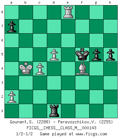 Last move : 1/2-1/2 2024 October 12 22:32:42 [Event "FICGS__CHESS__CLASS_M__000143"] [Site "FICGS"] [Date "2024.09.16"] [Round "1"] [White "Gounant,Stanislas"] [Black "Perevozchikov,Vjacheslav"] [Result "1/2-1/2"] [WhiteElo "2288"] [BlackElo "2255"] 1.b3 e5 2.Bb2 Nc6 3.e3 d5 4.Bb5 Bd6 5.f4 f6 6.Qh5+ g6 7.Qh4 Nge7 8.fxe5 fxe5 9.Nf3 O-O 10.Nc3 Nf5 11.Qxd8 Nxd8 12.e4 Nd4 13.Nxd4 exd4 14.Ne2 c6 15.Bd3 c5 16.exd5 Bf5 17.Bxf5 Rxf5 18.c4 Nf7 19.O-O-O Re8 20.Ng3 Rf2 21.Rde1 Rxe1+ 22.Rxe1 Ng5 23.Ne4 Nxe4 24.Rxe4 Rxg2 25.Kc2 Kf7 26.b4 b6 27.bxc5 bxc5 28.Ba3 Rxh2 29.Re6 Bf4 30.Bxc5 Rxd2+ 31.Kb3 Rd3+ 32.Kb4 Rd1 33.Re4 g5 34.Bxd4 h5 35.Be5 Kg6 36.Bxf4 Kf5 37.Re8 1/2-1/2 Follow this game move after move (download)In order to improve your game, you must study the endgame before everything else, for whereas the endings can be studied and mastered by themselves, the middle game and the opening must be studied in relation to the endgame. (Jose Raul Capablanca) Ohne Fehler kann es keine Brillanz geben. (Emanuel Lasker) Después de una mala apertura, hay una esperanza en el juego medio. Pero una vez que estas en finales, el momento de la verdad ha llegado. (Edmar Mednis) Des combinaisons [dans le jeu d'échecs] pareilles à des mélodies. Je crois entendre pour ainsi dire la musique des coups... (Vladimir Nabokov) Luck never gives; it only lends. (Swedish proverb)