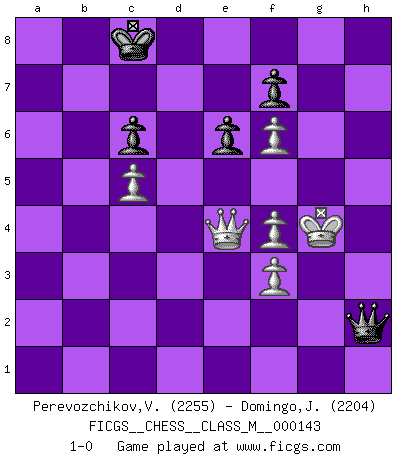 Last move : 1-0 2025 March 5 21:5:3 [Event "FICGS__CHESS__CLASS_M__000143"] [Site "FICGS"] [Date "2024.09.16"] [Round "1"] [White "Perevozchikov,Vjacheslav"] [Black "Domingo,Jordi"] [Result "1-0"] [WhiteElo "2255"] [BlackElo "2204"] 1.Nf3 d5 2.g3 Nf6 3.Bg2 c6 4.O-O Bg4 5.h3 Bxf3 6.exf3 e6 7.f4 Nbd7 8.d4 Be7 9.b3 O-O 10.c4 a5 11.Na3 g6 12.Nc2 Ne8 13.a4 Nd6 14.Ne3 Nf6 15.Bb2 Nf5 16.Qd3 h5 17.Bf3 Qb6 18.Rab1 Rfd8 19.Rfd1 Qc7 20.Ng2 Bf8 21.g4 Ne7 22.Qe3 Bg7 23.Ne1 dxc4 24.bxc4 Rac8 25.Qe5 Nd7 26.Qe3 Nf6 27.Ba3 b5 28.Bxe7 Qxe7 29.g5 Nd7 30.c5 bxa4 31.Ra1 Nxc5 32.dxc5 Bxa1 33.Rxa1 Rb8 34.Rxa4 Rb5 35.Rc4 Qb7 36.Nd3 Rb3 37.Rd4 Rxd4 38.Qxd4 a4 39.Ne5 Rxf3 40.Nxf3 a3 41.Nd2 a2 42.Qa1 Qa6 43.Ne4 Qa4 44.Nf6+ Kf8 45.Kh1 Ke7 46.Kg2 Kd8 47.Qe5 Kc8 48.Ne8 Kd7 49.Nf6+ Kc8 50.Ne8 Kd7 51.Qb8 Qe4+ 52.Kg3 a1Q 53.Nf6+ Qxf6 54.Qd6+ Kc8 55.gxf6 Kb7 56.Qe5 h4+ 57.Kg4 Qg2+ 58.Kxh4 Qf3 59.Qe3 Qd1 60.Qc3 Kc8 61.Qa3 Kb7 62.f3 Qd5 63.Kg3 Qd2 64.Qb3+ Kc8 65.Qb6 Qd5 66.Qa6+ Kb8 67.Qa3 Kb7 68.Qb2+ Kc8 69.Qe5 Qd2 70.Kh4 Qd8 71.Kg4 Kb7 72.Qb2+ Kc8 73.h4 Qd5 74.Qe5 Qd8 75.h5 gxh5+ 76.Kxh5 Qh8+ 77.Kg4 Qh2 78.Qe4 1-0 Follow this game move after move (download)The passed pawn is a criminal, who should be kept under lock and key. Mild measures, such as police surveillance, are not sufficient. (Nimzovitch) Wenn ich mich einlogge, glauben die Leute gewöhnlich nicht, dass ich es selbst bin und sie fangen an, mir dumme Fragen zu stellen. Und wenn sie es glauben, stellen sie wieder andere dumme Fragen. (Judith Polgar) Creo que una cierta cantidad de temperamento es esperada de los genios del Ajedrez. (Ron Gross) Karpov est une pièce de musée. (Garry Kasparov) Luck has a peculiar habit of favoring those who don't depend on it. (Author unknown)