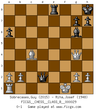 Last move : 0-1 2008 January 27 12:5:49 [Event "FICGS__CHESS__CLASS_B__000029"] [Site "FICGS"] [Date "2007.09.20"] [Round "1"] [White "Sobrecases,Guy"] [Black "Riha,Josef"] [Result "0-1"] [WhiteElo "2015"] [BlackElo "1948"] 1.e4 c5 2.Nf3 d6 3.d4 cxd4 4.Nxd4 Nf6 5.Nc3 a6 6.Bc4 e6 7.Bb3 b5 8.O-O b4 9.Nb1 Nxe4 10.Qf3 Bb7 11.Re1 d5 12.c4 Bc5 13.cxd5 Bxd5 14.Nxe6 fxe6 15.Rxe4 Bxe4 16.Qh5+ Bg6 17.Qxc5 Nd7 18.Qxb4 Qe7 19.Qg4 Nc5 20.Bc4 O-O 21.Be3 Nd3 22.Bxe6+ Kh8 23.Nd2 Rae8 24.Bc4 Nxf2 25.Bxf2 Rxf2 26.Kxf2 Qe3+ 27.Kf1 Qxd2 0-1 This chess game has been lost on time (started : 2007.09.20 15:28:55) Sicilian : Najdorf, Lipnitzky attack Kingside Castling by player White (move 8) Kingside Castling by player Black (move 20) Player Black won this chess game. Follow this game move after move (download)Up to this point White has been following well-known analysis. But now he makes a fatal error: he begins to use his own head. (Siegbert Tarrasch) Es gibt Leute, die glauben, alles wäre vernünftig, was man mit einem ernsthaften Gesicht tut. (Georg Christoph Lichtenberg) El Ajedrez es un regaderazo frío para la mente. (Sir John Simon) Toutes choses étant égales, c'est la conviction qui gagne. Alliée à une volonté de vaincre, elle sert de détonateur, suscite des idées, disperse les doutes et aide à penser clairement. (Robert Fischer) Train yourself to let go of everything you fear to lose. (Master Yoda in Star Wars ep.3)