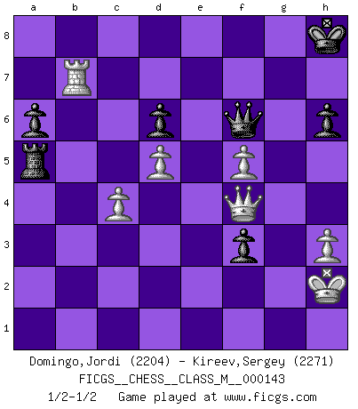 Last move : 1/2-1/2 2024 November 11 0:26:39 [Event "FICGS__CHESS__CLASS_M__000143"] [Site "FICGS"] [Date "2024.09.16"] [Round "1"] [White "Domingo,Jordi"] [Black "Kireev,Sergey"] [Result "1/2-1/2"] [WhiteElo "2204"] [BlackElo "2271"] 1.e4 c5 2.Nf3 Nc6 3.d4 cxd4 4.Nxd4 Nf6 5.Nc3 e5 6.Ndb5 d6 7.Nd5 Nxd5 8.exd5 Nb8 9.c4 Be7 10.Bd3 a6 11.Nc3 O-O 12.O-O f5 13.f3 Nd7 14.Rb1 Bg5 15.b4 Bxc1 16.Qxc1 b6 17.a3 Qh4 18.Qd2 Rb8 19.Be2 Nf6 20.a4 Nd7 21.Qe3 h6 22.Rb3 Qd8 23.h3 Qf6 24.Ra1 e4 25.f4 Rb7 26.Rab1 g5 27.Kh2 Kh8 28.a5 bxa5 29.bxa5 Rxb3 30.Rxb3 Rg8 31.Na4 Kh7 32.Rb1 Nf8 33.Bh5 gxf4 34.Qxf4 Nd7 35.Nb6 Ne5 36.Nxc8 Rxc8 37.Be2 Rc5 38.Rb7+ Kh8 39.g4 Rxa5 40.gxf5 Nf3+ 41.Bxf3 exf3 1/2-1/2 Follow this game move after move (download)The chessboard is the world, the pieces are the phenomena of the Universe, the rules of the game are what we call the laws of Nature and the player on the other side is hidden from us. (Thomas Huxley) Kasparov stellt für gewöhnlich die Regeln auf und bricht sie dann selbst wieder. (Alexej Shirov) Prefiero perder una partida realmente buena, que ganar una mala. (David Levy) Vous n'êtes pas toujours obligé de jouer le meilleur coup. Un coup doit être actif, entreprenant, correct et beau ! (David Bronstein) For to win one hundred victories in one hundred battles is not the acme of skill. To subdue the enemy without fighting is the acme of skill. (Sun Tzu)