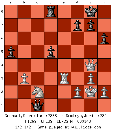 Last move : 1/2-1/2 2024 November 13 19:42:52 [Event "FICGS__CHESS__CLASS_M__000143"] [Site "FICGS"] [Date "2024.09.16"] [Round "1"] [White "Gounant,Stanislas"] [Black "Domingo,Jordi"] [Result "1/2-1/2"] [WhiteElo "2288"] [BlackElo "2204"] 1.b3 d5 2.Bb2 Nf6 3.Nf3 Bf5 4.g3 e6 5.Bg2 h6 6.O-O c6 7.d3 Be7 8.Nbd2 O-O 9.Re1 Bh7 10.e4 a5 11.a3 Nbd7 12.Qe2 b5 13.a4 Qb6 14.Bd4 Bc5 15.Bxc5 Nxc5 16.exd5 cxd5 17.axb5 Qxb5 18.Qe3 Na6 19.Ne5 Nb4 20.Rac1 Nd7 21.c4 Qb7 22.Nxd7 Qxd7 23.cxd5 exd5 24.Nf3 Rac8 25.Rxc8 Rxc8 26.Bh3 Bf5 27.Bxf5 Qxf5 28.Nd4 Qxd3 29.Qe5 Qc3 30.Re3 Qc7 31.Qf5 Rd8 32.Qg4 Qc1+ 33.Kg2 Nc2 34.Nxc2 1/2-1/2 Follow this game move after move (download)He who fears an isolated Queen's Pawn should give up Chess. (Siegbert Tarrasch) Es tut gut, die Entwicklungsperiode von, [...] demokratischem Geist durchdringen zu lassen. Wie undemokratisch wäre es doch beispielsweise, den einen Offizier große Spaziertouren vornehmen zu lassen, während die anderen zu Hause säßen und sich entsetzlich langweilten. (Aaron Nimzowitsch) El Ajedrez moderno está demasiado preocupado con cosas como la estructura de Peones. Olvidenlo, el Jaque Mate termina la partida. (Nigel Short) Vous m'avez demandé de vous exposer quel est le fondement de la prière. Je ne fais que préparer les pièces du jeu sur la table... Nous sera-t-il permis d'en adopter les règles et si nous les appliquons scrupuleusement nous ne tarderons pas à faire mat le Roi divin ! Il ne pourra échapper à nos mains. (Sainte Thérèse d'Avila, Chemin de perfection) Statistics can be made to prove anything - even the truth. (Author unknown)