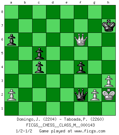 Last move : 1/2-1/2 2024 December 4 16:20:25 [Event "FICGS__CHESS__CLASS_M__000143"] [Site "FICGS"] [Date "2024.09.16"] [Round "1"] [White "Domingo,Jordi"] [Black "Taboada,Pedro Pablo"] [Result "1/2-1/2"] [WhiteElo "2204"] [BlackElo "2260"] 1.e4 c5 2.Nf3 d6 3.c3 Nf6 4.Be2 g6 5.O-O Bg7 6.Bb5+ Nc6 7.d4 O-O 8.d5 a6 9.Bd3 Na5 10.Bg5 b5 11.Nbd2 h6 12.Bh4 Re8 13.h3 e6 14.dxe6 Bxe6 15.Nh2 g5 16.Bg3 Bc4 17.Bxc4 Nxc4 18.Nxc4 bxc4 19.f3 d5 20.exd5 Nh5 21.Bf2 Nf4 22.Ng4 Rb8 23.Rb1 Nxd5 24.Re1 Rxe1+ 25.Qxe1 Qb6 26.Bg3 Bxc3 27.Nxh6+ Kh7 28.Qe4+ Kxh6 29.Qxd5 Qg6 30.Bxb8 Qxb1+ 31.Kh2 Qxb2 32.Bg3 Bf6 33.Qxf7 Qd4 34.f4 gxf4 35.Bf2 Qxf2 36.Qxf6+ Kh7 1/2-1/2 Follow this game move after move (download)In the perfect Chess combination as in a first-rate short story, the whole plot and counter-plot should lead up to a striking finale, the interest not being allayed until the very last moment. (Yates and Winter) Garry Kasparov war erst in der Großmeister-Organisation GMA, dann in der Profischach-Vereinigung PCA, zum Schluss kehrte er wieder in den Schoß der FIDE zurück. Aber gut, manche Leute sind flexibel (Viswanathan Anand) Te sientas frente a un tablero y repentinamente tu corazón brinca. Tu mano tiembla al tomar una pieza y moverla. Pero lo que el Ajedrez te enseña es que tu debes permanecer ahí con calma y pensar de que si realmente es una buena idea o de que si hay otras ideas mejores. (Stanley Kubrick) RxDa4 pat (...) Wisdom is the reward you get for a lifetime of listening when you'd have preferred to talk. (Doug Larson)