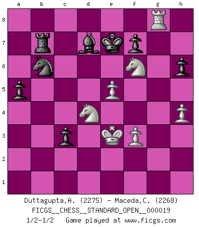 Last move : 1/2-1/2 2025 March 3 4:34:24 [Event "FICGS__CHESS__STANDARD_OPEN__000019"] [Site "FICGS"] [Date "2024.09.18"] [Round "2"] [White "Duttagupta,Aniruddha"] [Black "Maceda,Coco"] [Result "1/2-1/2"] [WhiteElo "2275"] [BlackElo "2268"] 1.c4 Nf6 2.Nc3 e6 3.d4 d5 4.cxd5 exd5 5.Bg5 c6 6.e3 h6 7.Bh4 Be7 8.Bd3 O-O 9.Nge2 Re8 10.O-O Nbd7 11.Qc2 Nh5 12.Bxe7 Qxe7 13.Bh7+ Kf8 14.Bd3 Kg8 15.a3 Nb6 16.h3 Bd7 17.Rae1 Rad8 18.a4 Nc8 19.b4 Nd6 20.b5 Qg5 21.Kh2 Rc8 22.bxc6 bxc6 23.Ba6 Rb8 24.Bd3 Nc4 25.Bxc4 dxc4 26.Rb1 a5 27.Rxb8 Rxb8 28.Qc1 Nf6 29.e4 Qxc1 30.Rxc1 Be8 31.f3 Nd7 32.Kg3 Kf8 33.Kf2 Rb4 34.g4 c5 35.h4 cxd4 36.Nxd4 Nb6 37.Ke3 Bd7 38.g5 Nxa4 39.gxh6 gxh6 40.Nd5 Rb7 41.Nf6 c3 42.Rg1 Nb6 43.Rg8+ Ke7 44.e5 1/2-1/2 Follow this game move after move (download)Chess is a forcing house where the fruits of character can ripen more fully than in life. (Edward Morgan Foster) Die Neutralität betrachte ich als eine schwere Krankheit. (Viktor Kortschnoi) Aquel que teme a un Peón de Reina aislado, debería de retirarse del Ajedrez. (Siegbert Tarrasch) Le pion, dans sa simplicité, marche droit devant lui, mais lorsqu'il prend, il le fait obliquement? Ainsi l'homme, tant qu'il reste pauvre, marche dans la droiture et vit honnêtement, mais lorsqu'il recherche les honneurs, il flatte, se parjure et, par les voies obliques, cherche une position supérieure sur l'échiquier du monde. (Jean de Galles) Men should grow up. - Yeah. And dogs should stop licking themselves. It's not gonna happen. (Gregory House to Dr. Cameron, House M.D.)