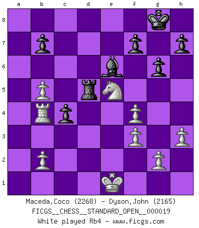 Last move : 1-0 2025 July 5 14:36:58 [Event "FICGS__CHESS__STANDARD_OPEN__000019"] [Site "FICGS"] [Date "2024.09.18"] [Round "2"] [White "Maceda,Coco"] [Black "Dyson,John"] [Result "1-0"] [WhiteElo "2268"] [BlackElo "2165"] 1.d4 d5 2.Nf3 Nf6 3.c4 e6 4.Nc3 a6 5.cxd5 exd5 6.Bg5 Be6 7.e3 Nbd7 8.Bd3 Bd6 9.Bf4 Nb6 10.O-O O-O 11.Qc2 Bxf4 12.exf4 Qd6 13.Ne5 c5 14.Nb5 axb5 15.dxc5 Qc7 16.cxb6 Qxb6 17.Qb3 b4 18.a3 Ne4 19.Qxb4 Qxb4 20.axb4 Nd2 21.Rfd1 Rxa1 22.Rxa1 g6 23.h3 Rc8 24.f3 Nc4 25.Bxc4 dxc4 26.Kf2 Rd8 27.Ke1 Rd6 28.Ra5 Rb6 29.b5 Rd6 30.Ra4 Rd5 31.Rb4 Rc5 32.Ng4 c3 33.bxc3 Rxc3 34.Nf6+ Kg7 35.Ne4 Rc2 36.g4 Bd5 37.Rd4 1-0 This chess game has been lost on time (started : 2024.09.18 8:15:47) Follow this game move after move (download)Chess problems demand from the composer the same virtues that characterize all worthwhile art: originality, invention, conciseness, harmony, complexity, and splendid insincerity. (Vladimir Nabokov) Im Internet Chess Club betrug mein Rating vorübergehend 3350 ELO-Punkte. (Sergej Karjakin) El Peón aislado arroja penumbra sobre todo el tablero. (Aaron Nimzovich) Lorsque vous vous retrouvez devant une position atroce, ne tendez pas un ultime piège dérisoire avec l'intention d'abandonner si l'adversaire le déjoue ! Faites-vous plutôt un devoir de résister comme si votre vie en dépendait. Jouez le coup qui vous déplairait au centuple si vous étiez dans la peau de votre tortionnaire ! If you work for a living, why do you kill yourself working ? (Tuco to a chicken in The Good, The Bad and The Ugly)