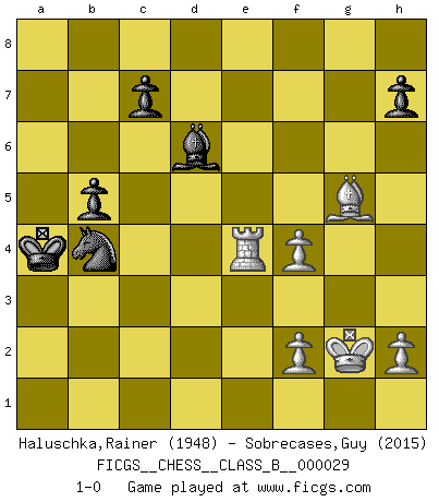 Last move : 1-0 2008 September 5 20:47:20 [Event "FICGS__CHESS__CLASS_B__000029"] [Site "FICGS"] [Date "2007.09.20"] [Round "1"] [White "Haluschka,Rainer"] [Black "Sobrecases,Guy"] [Result "1-0"] [WhiteElo "1948"] [BlackElo "2015"] 1.d4 d5 2.c4 Nc6 3.Nc3 dxc4 4.e3 e5 5.Nf3 exd4 6.exd4 Qe7+ 7.Be3 Be6 8.d5 O-O-O 9.Bxc4 Nf6 10.O-O Qb4 11.Qd3 Qa5 12.a3 Nxd5 13.Bxd5 Rxd5 14.Nxd5 Qxd5 15.Qxd5 Bxd5 16.Rad1 Bxf3 17.gxf3 a5 18.Kg2 Bd6 19.Rfe1 Re8 20.Bd2 Rg8 21.Re4 g5 22.Bc3 b5 23.b4 f5 24.Re6 axb4 25.axb4 Rg6 26.Re8+ Kd7 27.Rf8 Ke6 28.Re1+ Kd5 29.Rxf5+ Kc4 30.Bh8 Na7 31.Re4+ Kb3 32.Bd4 Nc6 33.Be3 Ka4 34.Rxg5 Rxg5+ 35.Bxg5 Nxb4 36.f4 1-0 This chess game has been lost on time (started : 2007.09.20 15:28:55) QGD : Chigorin defense Queenside Castling by player Black (move 8) Kingside Castling by player White (move 10) Player White won this chess game. Follow this game move after move (download)It's always better to sacrifice your opponent's men. (Savielly Tartakover) Der Freibauer hat für mich eine Seele, genau wie der Mensch, Wünsche, die unerkannt in ihm schlummern, und Befürchtungen, von deren Existenz er selbst kaum ahnt. (Aaron Nimzowitsch) Es el objetivo de la escuela moderna no tratar cada posición de acuerdo a una regla general, sino de acuerdo al principio inherente en la posición. (Richard Reti) Il (Jacob Murray) ne joue pas pour le bon coup, mais pour le meilleur. (Eloi Relange) Being number two sucks. (Andre Agassi)