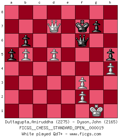 Last move : 1-0 2025 August 21 0:37:12 [Event "FICGS__CHESS__STANDARD_OPEN__000019"] [Site "FICGS"] [Date "2024.09.18"] [Round "1"] [White "Duttagupta,Aniruddha"] [Black "Dyson,John"] [Result "1-0"] [WhiteElo "2275"] [BlackElo "2165"] 1.e4 c6 2.d4 d5 3.e5 c5 4.dxc5 e6 5.a3 Bxc5 6.Nf3 f6 7.b4 Be7 8.Bb2 a5 9.b5 Nd7 10.c4 Nxe5 11.Nxe5 fxe5 12.Bxe5 Nf6 13.Be2 O-O 14.O-O Nd7 15.Bg3 Nc5 16.Nc3 d4 17.Na4 d3 18.Bf3 Rxf3 19.gxf3 b6 20.Nxc5 Bxc5 21.Ra2 e5 22.Rd2 Bf5 23.Re1 Qf6 24.Rxe5 Rd8 25.Rd5 Rxd5 26.cxd5 h5 27.h4 Bxa3 28.Rxd3 Bxd3 29.Qxd3 Bd6 30.Bxd6 Qxd6 31.Qe4 Kf7 32.Qf5+ Qf6 33.Qd7+ Qe7 34.Qc6 Qxh4 35.d6 Qg5+ 36.Kf1 Ke6 37.d7 Ke7 38.d8Q+ Kxd8 39.Qxb6+ Kc8 40.Qc6+ Kb8 41.b6 1-0 This chess game has been lost on time (started : 2024.09.18 8:15:47) Follow this game move after move (download)One of these modest little moves may be more embarrassing to your opponent than the biggest threat. (Siegbert Tarrasch) Wie ich sie so einen nach dem anderen nieder mähte wurde meine Überlegenheit offensichtlich. (José Raúl Capablanca) Con el tiempo, empecé a progresar en partidas decisivas. Tal vez porque me di cuenta de una simple verdad: no solo estaba yo nervioso sino también mi oponente. (Mikhail Tal) Toute estimation doit être constamment réévaluée. (Jacob Estrin) If only people were all showed a certain minimum level of niceness; if only people didn't retract verbal draw offers (without draw box ticked) on ficgs; if only people didn't kill; if only people didn't run concentration / extermination camps, if only people didn't drop nuclear bombs on Hiroshima and Nagasaki, and so on - it would be a much more beautiful world. But sadly, things are not so... (Normajean Yates)