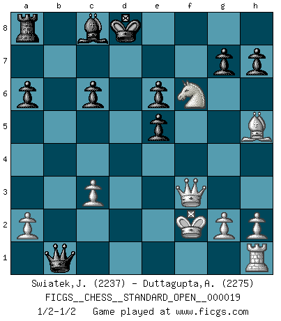Last move : 1/2-1/2 2024 November 30 13:34:48 [Event "FICGS__CHESS__STANDARD_OPEN__000019"] [Site "FICGS"] [Date "2024.09.18"] [Round "1"] [White "Swiatek,Janusz"] [Black "Duttagupta,Aniruddha"] [Result "1/2-1/2"] [WhiteElo "2237"] [BlackElo "2275"] 1.e4 c5 2.Nf3 d6 3.d4 cxd4 4.Nxd4 Nf6 5.Nc3 a6 6.Bg5 e6 7.f4 Qb6 8.Qd2 Qxb2 9.Rb1 Qa3 10.f5 Nc6 11.fxe6 fxe6 12.Nxc6 bxc6 13.Be2 Be7 14.e5 dxe5 15.Bxf6 Bxf6 16.Bh5+ Ke7 17.Rd1 Qc5 18.Ne4 Qd4 19.Qe2 Qb6 20.Qd3 Qa5+ 21.c3 Rd8 22.Qf3 Qb6 23.Rxd8 Kxd8 24.Nxf6 Qb1+ 25.Kf2 1/2-1/2 Follow this game move after move (download)Chess is ruthless: you've got to be prepared to kill people. (Nigel Short) Sitze auf Deine Hände. (Siegbert Tarrasch) La captura del Rey enemigo es la finalidad pero no el primer objetivo de la partida. (William Steinitz) Le succès, c'est être capable d'aller d'échec en échec sans perdre son enthousiasme. (Winston Churchill) Art is not a thing, it is a way. (Elbert Hubbard)