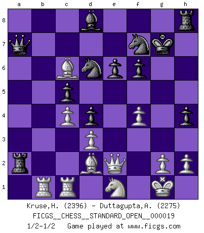 Last move : 1/2-1/2 2025 February 18 9:4:1 [Event "FICGS__CHESS__STANDARD_OPEN__000019"] [Site "FICGS"] [Date "2024.09.18"] [Round "2"] [White "Kruse,Herbert"] [Black "Duttagupta,Aniruddha"] [Result "1/2-1/2"] [WhiteElo "2396"] [BlackElo "2275"] 1.e4 c6 2.Nf3 d5 3.e5 Bg4 4.Be2 e6 5.O-O c5 6.c4 d4 7.d3 Nc6 8.Nbd2 Be7 9.Rb1 a5 10.Ne1 h5 11.f3 Bf5 12.f4 h4 13.Ne4 Qd7 14.Bd2 Nh6 15.Bf3 Bg6 16.Nc2 f6 17.exf6 gxf6 18.a3 Nf5 19.Qe2 Kf7 20.Rfc1 b6 21.b4 axb4 22.axb4 Ra2 23.bxc5 bxc5 24.Rb6 Nd8 25.Qd1 Nd6 26.Nf2 Kg7 27.Ne1 Qa4 28.Qe2 N8f7 29.Ne4 Bxe4 30.Bxe4 Bd8 31.Bc6 Qa7 32.R6b1 1/2-1/2 Follow this game move after move (download)The game of chess is the touchstone of the intellect. (Goethe) Ich verlor meine Bürgerrechte, mein Gehalt wurde mir nicht mehr bezahlt und ich wurde zensiert und durfte nicht mehr ins Ausland reisen. [nach dem Match Fischer-Taimanov 6:0] (Mark Taimanov) Cualquier cambio de material en una posición debe venir por medio de un mate, una captura o promoción de Peón. (Purdy) La vie est comme un jeu d'échecs : nous esquissons un plan, mais celui-ci est tributaire de ce que daignent faire l'adversaire aux échecs et le destin dans la vie. (Arthur Schopenhauer) Life doesn't imitate art, it imitates bad television. (Woody Allen)