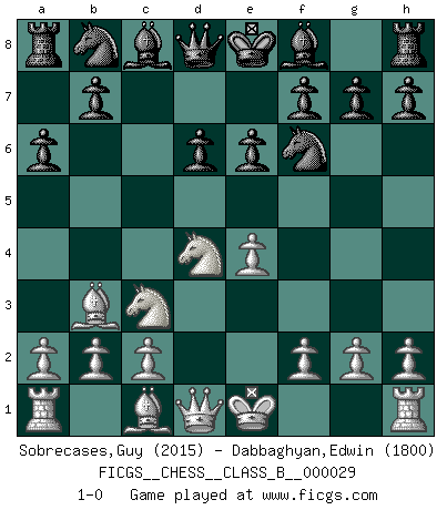 Last move : 1-0 2007 November 4 18:33:52 [Event "FICGS__CHESS__CLASS_B__000029"] [Site "FICGS"] [Date "2007.09.20"] [Round "1"] [White "Sobrecases,Guy"] [Black "Dabbaghyan,Edwin"] [Result "1-0"] [WhiteElo "2015"] [BlackElo "1800"] 1.e4 c5 2.Nf3 d6 3.d4 cxd4 4.Nxd4 Nf6 5.Nc3 a6 6.Bc4 e6 7.Bb3 1-0 This chess game has been lost on time (started : 2007.09.20 15:28:55) Sicilian : Najdorf, Lipnitzky attack Player White won this chess game. Follow this game move after move (download)Openings teach you openings. Endgames teach you chess ! (Stephan Gerzadowicz) Der zweitbeste Zug ist oft der einzig richtige. (Savielly Grigorievitsch Tartakower) ¡Examina movidas que hagan daño! Un buen ojo for movidas desvastantes es mucho mas importante que el conocimiento de principios estratégicos. (Purdy) Un millionnaire : 'Monsieur Steinitz ! Vous ne participez aux tournois que pour l'argent, alors que moi je n'y viens que pour l'honneur.' Steinitz : 'Chacun joue pour ce qu'il n'a pas'... Even the best needles are not sharp at both ends. (Chinese proverb)