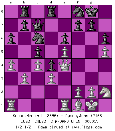 Last move : 1/2-1/2 2025 February 20 14:36:15 [Event "FICGS__CHESS__STANDARD_OPEN__000019"] [Site "FICGS"] [Date "2024.09.18"] [Round "1"] [White "Kruse,Herbert"] [Black "Dyson,John"] [Result "1/2-1/2"] [WhiteElo "2396"] [BlackElo "2165"] 1.e4 c6 2.Nf3 d5 3.e5 Bg4 4.Be2 e6 5.O-O c5 6.c4 d4 7.d3 Nc6 8.Nbd2 Qc7 9.a3 Bxf3 10.Nxf3 Nge7 11.Re1 Ng6 12.Bf1 Be7 13.Bd2 O-O 14.Qe2 Rab8 15.a4 Bd8 16.Qe4 Qe7 17.Bg5 Qc7 18.Bd2 Qe7 19.Bg5 Qc7 20.Bxd8 Rfxd8 21.h4 h6 22.h5 Nf8 23.Nh2 a6 24.b3 1/2-1/2 Follow this game move after move (download)When you are lonely, when you feel yourself an alien in the world, play Chess. This will raise your spirits and be your counselor in war. (Aristotle) Wie bekannt hörte Morphy 1859 auf, Schach zu spielen. Seine Enttäuschung galt nicht so sehr dem Schach, wie den Schachspielern. (Robert James Fischer) El Ajedrez no es como la vida... ¡tiene reglas!. (Mark Pasternak) On peut tirer plus d'utilité d'une partie perdue que de 100 parties gagnées. (Capablanca) A computer lets you make more mistakes faster than any invention in human history - with the possible exceptions of handguns and tequila. (Mitch Ratcliffe)
