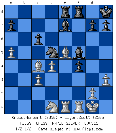 Last move : 1/2-1/2 2024 November 5 13:49:33 [Event "FICGS__CHESS__RAPID_SILVER__000311"] [Site "FICGS"] [Date "2024.09.19"] [Round "1"] [White "Kruse,Herbert"] [Black "Ligon,Scott"] [Result "1/2-1/2"] [WhiteElo "2396"] [BlackElo "2365"] 1.e4 e5 2.Nf3 Nf6 3.Nxe5 Nxe4 4.Qe2 Qe7 5.Qxe4 d6 6.f4 f5 7.Qe3 dxe5 8.fxe5 Nc6 9.Nc3 Nxe5 10.d4 Ng4 11.Qxe7+ Bxe7 12.Bc4 c6 13.O-O b5 14.Bd3 O-O 15.h3 Nf6 16.Bf4 Bd7 17.Rae1 Rae8 18.a4 b4 19.Bc4+ Kh8 20.Nd1 Nd5 21.Be5 f4 22.a5 Bf5 23.c3 bxc3 24.bxc3 1/2-1/2 Follow this game move after move (download)The game of Chess is not merely an idle amusement; several very valuable qualities of the mind are to be acquired and strengthened by it, so as to become habits ready on all occasions; for life is a kind of Chess. (Benjamin Franklin) Dass jemand wie Surab Asmaiparaschwili, der selbst Elopunkte gekauft hat , Vize-Präsident der Fide werden konnte, sagt schon einges über den Zustand dieser Organisation aus. (Joel Lautier) Una de estas pequeñas movidas modestas pudieran ser mas molestas a tu oponente que la amenaza mas grande. (Siegbert Tarrasch) Un footballeur joue avec ses pieds, parfois avec sa tête. Un joueur d'échecs ne joue qu'avec sa tête. Et quand il ne joue plus, il meurt. (Jacob Murray) You have to believe in yourself. (Sun Tzu)