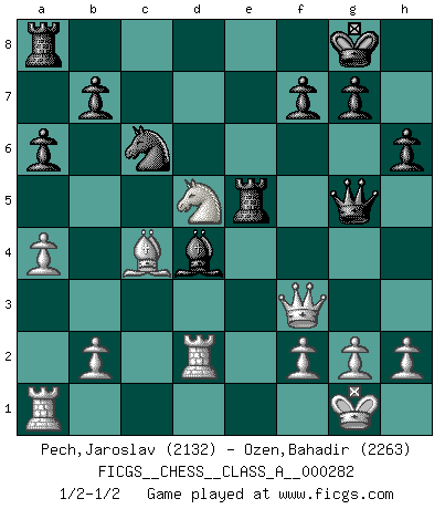 Last move : 1/2-1/2 2025 January 26 22:58:49 [Event "FICGS__CHESS__CLASS_A__000282"] [Site "FICGS"] [Date "2024.09.19"] [Round "1"] [White "Pech,Jaroslav"] [Black "Ozen,Bahadir"] [Result "1/2-1/2"] [WhiteElo "2132"] [BlackElo "2263"] 1.d4 d5 2.c4 dxc4 3.Nf3 Nf6 4.e3 e6 5.Bxc4 c5 6.O-O a6 7.a4 Nc6 8.Qe2 cxd4 9.Rd1 Be7 10.exd4 O-O 11.Nc3 Nb4 12.Bg5 h6 13.Bh4 Bd7 14.Ne5 Bc6 15.Nxc6 Nxc6 16.Bxf6 Bxf6 17.d5 exd5 18.Nxd5 Re8 19.Qh5 Bd4 20.Rd2 Re5 21.Qf3 Qg5 1/2-1/2 Follow this game move after move (download)Who is your opponent tonight, tonight I am playing against the Black pieces. (Akiba Rubinstein) Ein Schachspiel besteht aus drei Phasen: Die erste, wenn du hofftst den Vorteil zu haben, die zweite, wenn du glaubst einen Vorteil zu haben, und die dritte.... wenn du weißt Du wirst verlieren. (Savielly Grigorievitsch Tartakower) Tu puedes aprender mucho mas de una partida que pierdas que de una partida ganada. Tendras que perder cientos de partidas antes de llegar a ser un buen jugador. (Jose Raul Capablanca) La vérité est comme le meilleur coup aux échecs : elle existe, mais il faut la chercher. (Arturo Perez-Reverte) Whatever you do, don't be bored. This is absolutely the most exciting time we could have possibly hoped to be alive. And things are just starting. (From movie Waking life)