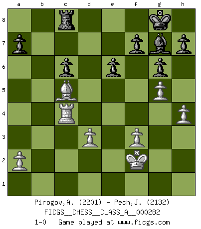 Last move : 1-0 2025 June 7 2:34:31 [Event "FICGS__CHESS__CLASS_A__000282"] [Site "FICGS"] [Date "2024.09.19"] [Round "1"] [White "Pirogov,Andrey Mikhaylovich"] [Black "Pech,Jaroslav"] [Result "1-0"] [WhiteElo "2201"] [BlackElo "2132"] 1.e4 c5 2.Nf3 Nc6 3.d4 cxd4 4.Nxd4 Nf6 5.Nc3 g6 6.Bc4 d6 7.Nxc6 bxc6 8.e5 Ng4 9.exd6 Qxd6 10.f3 Qxd1+ 11.Nxd1 Ne5 12.Bb3 Ba6 13.Bd2 Bg7 14.Kf2 e6 15.Re1 Nd7 16.Be3 O-O 17.Nc3 Nb6 18.Rad1 Nd5 19.Bc5 Rfb8 20.Ne4 Bxb2 21.g4 Nf6 22.g5 Nxe4+ 23.Rxe4 Rb7 24.h4 Bc3 25.Bc4 Bxc4 26.Rxc4 Bg7 27.Rd3 Rc8 28.Rb3 Rd7 29.Rd3 Rxd3 30.cxd3 1-0 Follow this game move after move (download)He who takes the Queen's Knight's Pawn will sleep in the streets. (Anonymous) Wenn Du absolut nicht mehr weißt, was Du tun sollst, dann ist es Zeit für Panik. (John van der Wiel) La pasion por jugar al Ajedrez es una de las mas inexplicables en el mundo. (H.G. Wells) Si le désir cupide (et stupide) de gagner est une inépuisable source de souffrance, une combinaison brillante sur l'échiquier est une découverte : le coquelicot qui s'épanouit lorsque apparaît la Voie Lactée. (Arrabal) Employ the attack like tactic of defense. (Chinese proverb)
