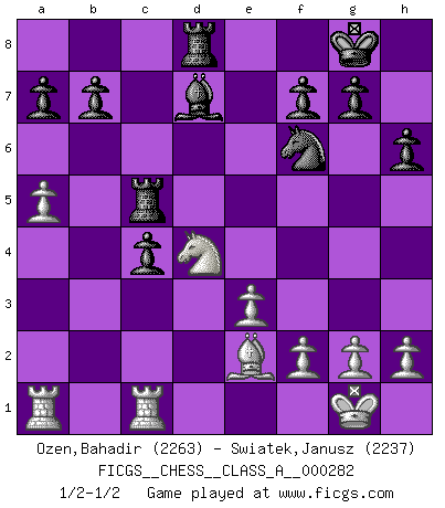 Last move : 1/2-1/2 2024 October 26 7:57:34 [Event "FICGS__CHESS__CLASS_A__000282"] [Site "FICGS"] [Date "2024.09.19"] [Round "1"] [White "Ozen,Bahadir"] [Black "Swiatek,Janusz"] [Result "1/2-1/2"] [WhiteElo "2263"] [BlackElo "2237"] 1.d4 Nf6 2.c4 e6 3.Nf3 d5 4.Nc3 Bb4 5.cxd5 exd5 6.Bg5 h6 7.Bh4 O-O 8.e3 Bf5 9.Qb3 Bxc3+ 10.Qxc3 Nbd7 11.Be2 Ne4 12.Bxd8 Nxc3 13.bxc3 Rfxd8 14.a4 c5 15.O-O Rac8 16.a5 Nf6 17.Rfc1 Rc7 18.dxc5 Rxc5 19.Nd4 Bd7 20.c4 dxc4 1/2-1/2 Follow this game move after move (download)Let the perfectionist play postal. (Yasser Seirawan) Wenn Capablanka heute auf der Schachbühne erscheinen würde, hätte er ein halbes Jahr gebraucht um sich die Schachtheorie anzueignen. Und dann hätte er alles und jeden besiegt. (Mikhail Moiseyevich Botvinik) La vida es como un juego de Ajedrez, cambiando con cada movimiento. (Proverbio Chino) Aidez vos pièces, elles vous aideront. (Paul Morphy) It's not a bug - it's an undocumented feature. (Anonymous)