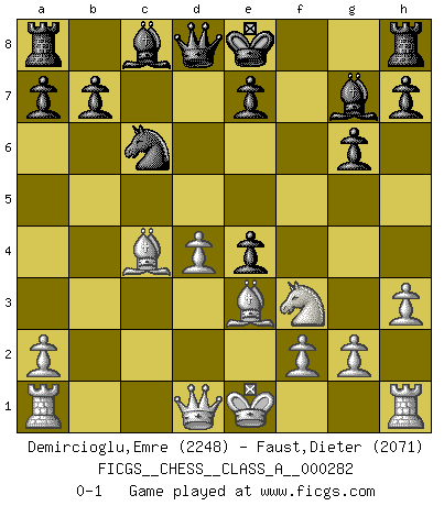 Last move : 0-1 2024 December 18 12:18:24 [Event "FICGS__CHESS__CLASS_A__000282"] [Site "FICGS"] [Date "2024.09.19"] [Round "1"] [White "Demircioglu,Emre"] [Black "Faust,Dieter"] [Result "0-1"] [WhiteElo "2248"] [BlackElo "2071"] 1.d4 Nf6 2.c4 g6 3.Nc3 d5 4.Nf3 Bg7 5.cxd5 Nxd5 6.e4 Nxc3 7.bxc3 c5 8.h3 Nc6 9.Be3 cxd4 10.cxd4 f5 11.Bc4 fxe4 0-1 This chess game has been lost on time (started : 2024.09.19 22:47:42) Follow this game move after move (download)You cannot play at Chess if you are kind-hearted. (French Proverb) Ich liebe den Moment, wenn ich das Ego meines Gegenüber breche. (Robert James Fischer) El juego de Fischer siempre fue nítido, racional y brillante. Uno de los mejores por siempre. (Dave Regis) Le moment que je préfère le plus dans une rencontre, c'est celui où je sens que la personnalité de l'adversaire se brise. (Robert Fischer) May I never be complete. May I never be content. May I never be perfect. Deliver me, Tyler, from being perfect and complete. (Chuck Palahniuk, Fight Club)