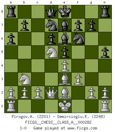 Last move : 1-0 2024 December 31 16:47:24 [Event "FICGS__CHESS__CLASS_A__000282"] [Site "FICGS"] [Date "2024.09.19"] [Round "1"] [White "Pirogov,Andrey Mikhaylovich"] [Black "Demircioglu,Emre"] [Result "1-0"] [WhiteElo "2201"] [BlackElo "2248"] 1.e4 c5 2.Nf3 d6 3.d4 cxd4 4.Nxd4 Nf6 5.Nc3 a6 6.f3 e5 7.Nb3 Be7 8.Be3 Be6 9.Qd2 h5 10.Be2 Nbd7 11.Nd5 1-0 This chess game has been lost on time (started : 2024.09.19 22:47:42) Follow this game move after move (download)Chess, like any creative activity, can exist only through the combined efforts of those who have creative talent, and those who have the ability to organize their creative work. (Mikhail Botvinnik) Kein Schachspieler kann gut schlafen. (H. G. Wells) Cada Peón es una Reina en potencia. (James Mason) La tactique, c'est ce que vous faites quand il y a quelque chose à faire; la stratégie, c'est ce que vous faites quand il n'y a rien à faire. (Savielli Tartacower) Bobby never cared about money, though. His only desire was to prove that his choices were correct: He wanted chess to be important because he was a chess player, and he wanted to be important. Bobby knew money was important, but he didn't have a clue why, outside of clothes and status. The only way he could accomplish what he wanted was to fight for a lot of money. Once he got it, he gave it away. He did not know how to spend it. And once he'd become champion, after, essentially, sacrificing his life for it, he didn't know how to spend his time. (Bob Wade)