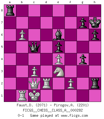 Last move : 0-1 2025 March 5 7:45:54 [Event "FICGS__CHESS__CLASS_A__000282"] [Site "FICGS"] [Date "2024.09.19"] [Round "1"] [White "Faust,Dieter"] [Black "Pirogov,Andrey Mikhaylovich"] [Result "0-1"] [WhiteElo "2071"] [BlackElo "2201"] 1.e4 c5 2.Nf3 Nc6 3.d4 cxd4 4.Nxd4 Nf6 5.Nc3 e5 6.Ndb5 d6 7.Bg5 a6 8.Na3 b5 9.Nd5 Be7 10.Bxf6 Bxf6 11.c3 O-O 12.Nc2 Bg5 13.a4 bxa4 14.Nce3 Rb8 15.Qxa4 Bxe3 16.Nxe3 Ne7 17.O-O-O Qc7 18.Rd2 Be6 19.Bc4 Nc6 20.Re1 Na5 21.Nd5 Qxc4 22.Qxa5 h6 23.Ne7+ Kh7 24.Rxd6 Rb5 25.Qxa6 Rfb8 26.Rd2 Qc5 27.Nd5 Ra5 28.Qe2 f5 29.g4 fxg4 30.Kc2 R5a8 31.Rb1 Rf8 32.Qe3 Qc4 33.Qd3 Qa2 34.Kc1 Rf3 35.Qc2 Rh3 36.b4 Qc4 37.Ne3 Qc8 38.b5 Rxh2 39.b6 Qc5 0-1 Follow this game move after move (download)Discovered check is the dive bomber of the Chessboard. (Reuben Fine) Obwohl ich alt bin, darf mir niemand den Finger in den Mund stecken, sonst beisse ich. (Wilhelm Steinitz) Yo siempre he tenido un ligero sentimiento de lástima por una persona que no tiene conocimiento del Ajedrez. (Siegbert Tarrasch) Même un GMI sait rarement calculer sur plus de cinq coups une attaque à sacrifices. (Rudolf Spielmann) Luck has a peculiar habit of favoring those who don't depend on it. (Author unknown)
