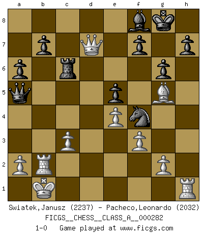 Last move : 1-0 2025 January 19 3:43:50 [Event "FICGS__CHESS__CLASS_A__000282"] [Site "FICGS"] [Date "2024.09.19"] [Round "1"] [White "Swiatek,Janusz"] [Black "Pacheco,Leonardo"] [Result "1-0"] [WhiteElo "2237"] [BlackElo "2032"] 1.e4 c5 2.Nf3 Nc6 3.d4 cxd4 4.Nxd4 e5 5.Nb5 d6 6.c4 Nf6 7.N5c3 g6 8.Na3 Bg7 9.f3 O-O 10.Be3 Be6 11.Qd2 Nd4 12.O-O-O Rc8 13.Kb1 a6 14.Ne2 Nc6 15.Nc3 Nd4 16.Nc2 Bxc4 17.Bxc4 Rxc4 18.Qd3 Nxc2 19.Qxc2 Qc7 20.Qd3 Rc6 21.Bg5 Qa5 22.h4 Rfc8 23.h5 Rxc3 24.bxc3 Nxh5 25.Qxd6 Bf8 26.Qd7 Rc6 27.Rd2 Nf4 28.Rb2 1-0 Follow this game move after move (download)Chess is a sea in which a gnat may drink and an elephant may bathe. (Hindu proverb) Über Frauen: Chess is better. (Robert James Fischer) El Rey es una pieza de pelea. ¡Usenlo!. (Wilhelm Steinitz) Psychologiquement, tu dois avoir confiance en toi même, mais cette confiance doit être basée sur des faits. (Robert Fischer) What doesn't kill us makes us stronger. (Friedrich Nietzsche)