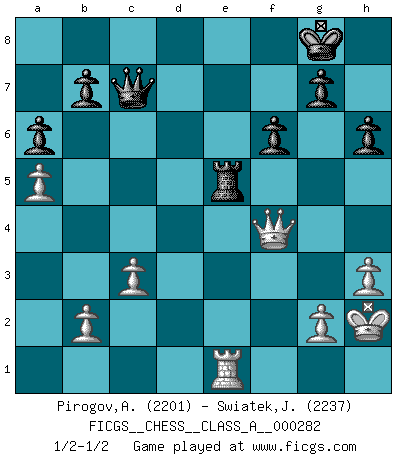 Last move : 1/2-1/2 2025 February 28 18:41:34 [Event "FICGS__CHESS__CLASS_A__000282"] [Site "FICGS"] [Date "2024.09.19"] [Round "1"] [White "Pirogov,Andrey Mikhaylovich"] [Black "Swiatek,Janusz"] [Result "1/2-1/2"] [WhiteElo "2201"] [BlackElo "2237"] 1.e4 e5 2.Nf3 Nc6 3.Bb5 Nf6 4.d3 Bc5 5.c3 d5 6.exd5 Qxd5 7.Bc4 Qd8 8.Bg5 h6 9.Bxf6 Qxf6 10.Nbd2 Bd6 11.a4 O-O 12.O-O Be6 13.Re1 a6 14.Ne4 Qe7 15.Bxe6 Qxe6 16.Nxd6 cxd6 17.d4 Qe7 18.Re3 Qc7 19.Qd3 Rad8 20.Rae1 Ne7 21.Qc2 Nd5 22.R3e2 Nf4 23.Rd2 Qd7 24.h3 Qc6 25.Kh2 Ng6 26.dxe5 dxe5 27.Rxd8 Rxd8 28.Nxe5 Qc7 29.Qf5 Re8 30.f4 Nxf4 31.Qxf4 f6 32.a5 Rxe5 1/2-1/2 Follow this game move after move (download)The battle for the ultimate truth will never be won. And that's why Chess is so fascinating. (Hans Kmoch) Ich spiele 70 Eröffnungssysteme. (Viktor Kortschnoi) ¿Esta Bobby Fischer algo cuerdo?. (Salo Flohr) Dans le domaine de la peinture, de la gravure et de la sculpture, dès la première décennie de notre siècle, les artistes abandonnent la représentation de la partie d'échecs pour se concentrer sur les pièces, sur les échiquiers et sur toutes les variations auxquelles les unes et les autres peuvent donner lieu. On passe en quelque sorte d'un thème social à un thème musical (au sens de la musica médiévale, c'est-à-dire d'une notion qui inclue le rythme, l'harmonie, la construction et la déconstruction, etc.). Graphiquement et picturalement, l'échiquier apparaît comme une structure ouverte, dynamique, d'une richesse infinie, autorisant toutes les combinatoires et débouchant sur des mouvements et des rythmes de nature exponentielle. (Michel Pastoureau) Experience is the name we all give to our mistakes. (Oscar Wilde)