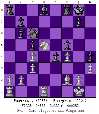 Last move : 0-1 2025 January 22 0:13:35 [Event "FICGS__CHESS__CLASS_A__000282"] [Site "FICGS"] [Date "2024.09.19"] [Round "1"] [White "Pacheco,Leonardo"] [Black "Pirogov,Andrey Mikhaylovich"] [Result "0-1"] [WhiteElo "2032"] [BlackElo "2201"] 1.e4 c5 2.Nc3 Nc6 3.Nf3 e5 4.Bc4 Be7 5.d3 d6 6.h3 Nf6 7.Nh2 O-O 8.Ng4 Nd7 9.Nd5 Nb6 10.Nxb6 axb6 11.c3 Be6 12.O-O d5 13.exd5 Bxd5 14.Ne3 Bxc4 15.dxc4 Qxd1 16.Rxd1 f5 17.Nd5 Bd8 18.f4 e4 19.Be3 h5 20.Bf2 h4 0-1 Follow this game move after move (download)Fischer is the strongest player in the world. In fact, the strongest player who ever lived. (Larry Evans) Wie bekannt hörte Morphy 1859 auf, Schach zu spielen. Seine Enttäuschung galt nicht so sehr dem Schach, wie den Schachspielern. (Robert James Fischer) La enorme capacidad mental, en la que sin ella no puede un jugador de Ajedrez existir, es demasiado requerida por el Ajedrez al grado de que nunca podrá liberar su mente de este juego. (Albert Einstein) Les échecs sont plus proches de l'art de l'assassinat que de l'art de la guerre. (Arturo Perez-Reverte) Plans are ideas that never come to fruition. (Daniel Parmet)