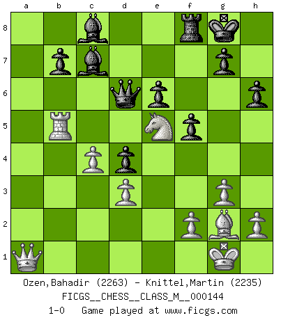 Last move : 1-0 2025 February 12 23:28:5 [Event "FICGS__CHESS__CLASS_M__000144"] [Site "FICGS"] [Date "2024.09.21"] [Round "1"] [White "Ozen,Bahadir"] [Black "Knittel,Martin"] [Result "1-0"] [WhiteElo "2263"] [BlackElo "2235"] 1.Nf3 d5 2.g3 Nf6 3.Bg2 c5 4.O-O e6 5.c4 d4 6.e3 Nc6 7.d3 Bd6 8.exd4 cxd4 9.Bg5 h6 10.Bxf6 Qxf6 11.Nbd2 Qe7 12.a3 a5 13.Ne4 Bc7 14.b4 axb4 15.axb4 Rxa1 16.Qxa1 f5 17.Nc5 O-O 18.Rb1 Nxb4 19.Rxb4 Qxc5 20.Rb5 Qd6 21.Ne5 1-0 This chess game has been lost on time (started : 2024.09.21 19:6:50) Follow this game move after move (download)Chess is like war on a board. (Bobby Fischer) Der Verteidiger gebe der Gewalt nach, aber nur der Gewalt. Er schaffe sich nicht freiwillig, etwa aus Blindheit oder aus Schrecken, irgendwelche Schwächen. Er lasse sich nicht bluffen. (Emanuel Lasker) Bobby Fischer es el jugador de Ajedrez mas grande que jamás haya existido. (Ken Smith) Horreur, mais aussi harmonie suprême : qu'y avait-il en effet au monde en dehors des échecs ? Le brouillard, l'inconnu, le non-être... (Vladimir Nabokov) It's unlucky to be superstitious. (Dave Enteles)