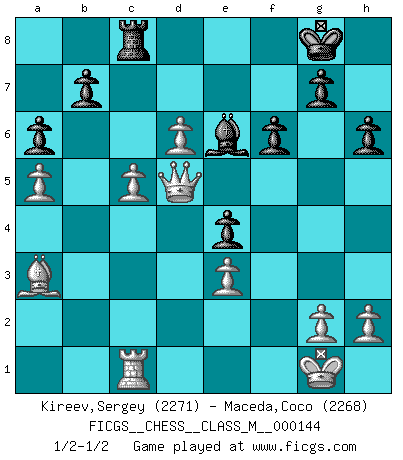 Last move : 1/2-1/2 2024 December 12 21:54:34 [Event "FICGS__CHESS__CLASS_M__000144"] [Site "FICGS"] [Date "2024.09.21"] [Round "1"] [White "Kireev,Sergey"] [Black "Maceda,Coco"] [Result "1/2-1/2"] [WhiteElo "2271"] [BlackElo "2268"] 1.e4 c5 2.Nc3 Nc6 3.Nge2 Nf6 4.d4 cxd4 5.Nxd4 e5 6.Ndb5 d6 7.Nd5 Nxd5 8.exd5 Nb8 9.a4 Be7 10.Be2 O-O 11.Bd2 Bf5 12.O-O Nd7 13.a5 a6 14.Na3 Be4 15.c4 Rc8 16.b4 Bg6 17.Rc1 Bg5 18.Nc2 e4 19.Ne3 Re8 20.Bg4 h6 21.c5 dxc5 22.d6 Rc6 23.Bxd7 Qxd7 24.bxc5 Re5 25.Bb4 Bxe3 26.fxe3 f6 27.Ba3 Rc8 28.Rf2 Bf7 29.Rd2 Be6 30.Kh1 Qc6 31.Rd4 Rd5 32.Kg1 Rxd4 33.Qxd4 Qd5 34.Qxd5 1/2-1/2 Follow this game move after move (download)Strategy requires thought, tactics require observation. (Max Euwe) Über die Verhaftung Bobby Fischers: Warum es die Bush-Administration für nötig befindet einen 61 Jahre alten Mann zu hetzten, der für niemanden ausser sich selbste eine Gefahr darstellt ist ein Rätsel. (Nigel Short) Un Peón pasado aumenta su poder a medida de que el número de piezas en el tablero disminuye. (Capablanca) Tout change constamment, y compris dans le monde des Echecs. (Botvinnik) Better than a thousand days of diligent study is one day with a great teacher. (Japanese proverb)