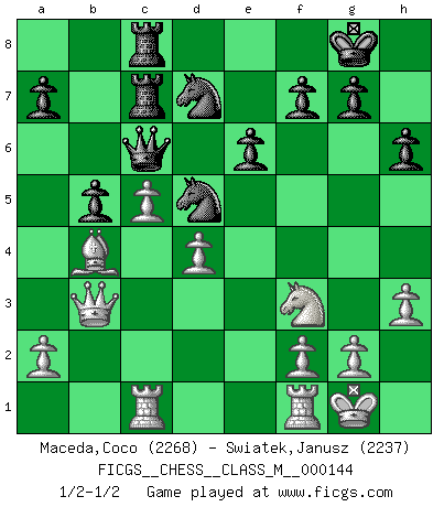 Last move : 1/2-1/2 2024 December 12 21:55:43 [Event "FICGS__CHESS__CLASS_M__000144"] [Site "FICGS"] [Date "2024.09.21"] [Round "1"] [White "Maceda,Coco"] [Black "Swiatek,Janusz"] [Result "1/2-1/2"] [WhiteElo "2268"] [BlackElo "2237"] 1.d4 Nf6 2.c4 e6 3.Nc3 Bb4 4.e3 O-O 5.Bd3 d5 6.Nf3 dxc4 7.Bxc4 c5 8.O-O cxd4 9.exd4 b6 10.Bg5 Bb7 11.Qe2 Bxc3 12.bxc3 Nbd7 13.Bd3 Qc7 14.Rac1 h6 15.Bd2 Ng4 16.Be4 Bxe4 17.Qxe4 Ngf6 18.Qe2 Rac8 19.c4 Rfd8 20.h3 Qc6 21.Bb4 Rc7 22.Qb2 Rdc8 23.Qb3 b5 24.c5 Nd5 1/2-1/2 Follow this game move after move (download)In the perfect Chess combination as in a first-rate short story, the whole plot and counter-plot should lead up to a striking finale, the interest not being allayed until the very last moment. (Yates and Winter) Ich bewundere Kasparows phantasievolle Angriffssiege aus den Achtzigern und Neunzigern, aber wenn man sie mit dem Computer überprüft, nimmt der Computer in jeder zweiten Partie die Opfer an, verteidigt sich und gewinnt. (Vladimir Kramnik) Repentinamente, me resultaba obvio en mi analisis que yo había pasado por alto lo que Fischer había visto en el tablero con la mas grande facilidad. (Mikhail Botvinnik) Les Echecs sont affaire de jugement sensible. Savoir quand frapper et quand esquiver. (Fischer) Drag your thoughts away from your troubles... by the ears, by the heels, or any other way you can manage it. (Mark Twain)