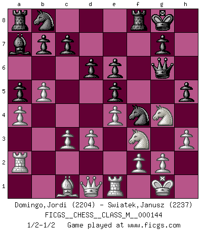 Last move : 1/2-1/2 2024 November 16 7:13:8 [Event "FICGS__CHESS__CLASS_M__000144"] [Site "FICGS"] [Date "2024.09.21"] [Round "1"] [White "Domingo,Jordi"] [Black "Swiatek,Janusz"] [Result "1/2-1/2"] [WhiteElo "2204"] [BlackElo "2237"] 1.e4 e5 2.Nf3 Nc6 3.Bc4 Bc5 4.c3 Nf6 5.d3 a6 6.a4 d6 7.Nbd2 O-O 8.h3 Be6 9.Bxe6 fxe6 10.b4 Ba7 11.O-O Qe8 12.Re1 Qg6 13.Nf1 Nh5 14.N1h2 a5 15.b5 Nb8 16.Ra2 Nf4 17.Ng4 h5 18.Nh4 Qg5 19.Nf3 Qg6 20.Nh4 Qg5 21.Nf3 Qg6 1/2-1/2 Follow this game move after move (download)A good player is always lucky. (Jose Raul Capablanca) Deine Wertungszahl - vorausgesetzt einige Jahre schachliche Anstrengung - entspricht etwa dem zehnfachen Deines IQ plus 1000. (Jonathan Levitt) La enorme capacidad mental, en la que sin ella no puede un jugador de Ajedrez existir, es demasiado requerida por el Ajedrez al grado de que nunca podrá liberar su mente de este juego. (Albert Einstein) Le pion, dans sa simplicité, marche droit devant lui, mais lorsqu'il prend, il le fait obliquement? Ainsi l'homme, tant qu'il reste pauvre, marche dans la droiture et vit honnêtement, mais lorsqu'il recherche les honneurs, il flatte, se parjure et, par les voies obliques, cherche une position supérieure sur l'échiquier du monde. (Jean de Galles) To send light into the darkness of men's hearts - such is the duty of the artist. (Schumann)