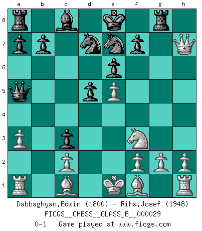 Last move : 0-1 2007 November 28 19:54:11 [Event "FICGS__CHESS__CLASS_B__000029"] [Site "FICGS"] [Date "2007.09.20"] [Round "1"] [White "Dabbaghyan,Edwin"] [Black "Riha,Josef"] [Result "0-1"] [WhiteElo "1800"] [BlackElo "1948"] 1.e4 e6 2.d4 d5 3.Nc3 Bb4 4.e5 c5 5.a3 Ba5 6.b4 cxd4 7.Qg4 Ne7 8.bxa5 dxc3 9.Qxg7 Rg8 10.Qxh7 Qxa5 11.Nf3 Nd7 0-1 French : Winawer, Advance, 5.a3 Player Black won this chess game. Follow this game move after move (download)No other master has such a terrific will to win. At the board he radiates danger, and even the strongest opponents tend to freeze, like rabbits when they smell a panther. Even his weaknesses are dangerous. As white, his opening game is predictable - you can make plans against it - but so strong that your plans almost never work. In the middle game his precision and invention are fabulous, and in the end game you simply cannot beat him. (Anonymous German Expert) Kein Schachspieler kann gut schlafen. (H. G. Wells) No hay precio que no valga la pena por la cabellera del Rey enemigo. (Koblentz) Aux échecs, l'amour-propre est satisfait quand on remporte la victoire, mais il n'y a pas de honte à être battu. (Benjamin Franklin) Without enthusiasm, virtue functions not at all, and vice only poorly. (Mignon McLaughlin, The Neurotic's Notebook, 1960)