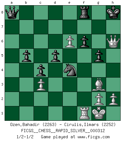 Last move : 1/2-1/2 2024 October 9 14:14:12 [Event "FICGS__CHESS__RAPID_SILVER__000312"] [Site "FICGS"] [Date "2024.09.30"] [Round "1"] [White "Ozen,Bahadir"] [Black "Cirulis,Ilmars"] [Result "1/2-1/2"] [WhiteElo "2263"] [BlackElo "2252"] 1.d4 Nf6 2.c4 c6 3.Nc3 d5 4.Nf3 e6 5.Bg5 h6 6.Bh4 dxc4 7.e4 g5 8.Bg3 b5 9.Ne5 Nbd7 10.Nxc6 Qb6 11.d5 Bb7 12.a4 a6 13.Be2 Bxc6 14.dxc6 Qxc6 15.e5 Nd5 16.Bf3 Bb4 17.O-O Bxc3 18.axb5 axb5 19.Bxd5 exd5 20.Rxa8+ Qxa8 21.bxc3 O-O 22.f4 Nc5 23.Qh5 Ne4 24.fxg5 hxg5 25.e6 f6 26.Qg6+ Kh8 27.Qh6+ 1/2-1/2 Follow this game move after move (download)Good positions don't win games, good moves do. (Gerald Abrahams) Ein guter Spieler hat immer Glück. (José Raúl Capablanca) El Ajedrez es la vida. (Bobby Fischer) Je crois qu'il existe des manières très spécifiques de jouer efficacement contre une machine. Evidemment, nous n'avons aucune chance en technique pure, parce que l'ordinateur calcule de manière parfaite. Mais lorsque nous faisons appel à notre cerveau, en utilisant l'intuition et la compréhension, alors nous restons beaucoup plus forts. (Anatoli Karpov) Do not put your faith in what statistics say until you have carefully considered what they do not say. (William W. Watt)