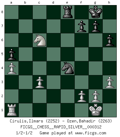 Last move : 1/2-1/2 2024 October 9 14:8:29 [Event "FICGS__CHESS__RAPID_SILVER__000312"] [Site "FICGS"] [Date "2024.09.30"] [Round "2"] [White "Cirulis,Ilmars"] [Black "Ozen,Bahadir"] [Result "1/2-1/2"] [WhiteElo "2252"] [BlackElo "2263"] 1.e4 e5 2.Nf3 Nc6 3.Bb5 Nf6 4.d3 Bc5 5.O-O Nd4 6.Bc4 d6 7.a4 a5 8.Nbd2 O-O 9.c3 Nxf3+ 10.Nxf3 h6 11.h3 Re8 12.Re1 Be6 13.Bxe6 Rxe6 14.Be3 Bxe3 15.Rxe3 d5 16.Qb3 dxe4 17.dxe4 Rb6 18.Qc2 Qd6 19.Rd3 Rxb2 20.Qxb2 Qxd3 21.Qxb7 Qxe4 22.Qxc7 Nd5 23.Qc6 Nf6 24.Nxe5 Re8 25.Qxe4 Nxe4 26.Nc6 1/2-1/2 Follow this game move after move (download)The tactician must know what to do whenever something needs doing; the strategist must know what to do when nothing needs doing. (Savielly Tartakover) Oft bringt ein stiller Zug das Erdbeben. (Richard Reti) El Jaque al descubierto es el bombardero del tablero. (Reuben Fine) Soyez une menace à chaque fois que vous vous asseyez pour jouer. (Ken Smith) Chess is everything: art, science and sport. (Anatoly Karpov)