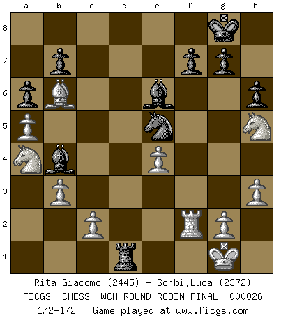 Last move : 1/2-1/2 2024 November 11 14:32:55 [Event "FICGS__CHESS__WCH_ROUND_ROBIN_FINAL__000026"] [Site "FICGS"] [Date "2024.10.01"] [Round "1"] [White "Rita,Giacomo"] [Black "Sorbi,Luca"] [Result "1/2-1/2"] [WhiteElo "2445"] [BlackElo "2372"] 1.e4 c5 2.Nf3 d6 3.d4 cxd4 4.Nxd4 Nf6 5.Nc3 a6 6.Bd3 e5 7.Nde2 Be7 8.O-O O-O 9.h3 Be6 10.f4 exf4 11.Nxf4 Nbd7 12.Be3 Ne5 13.a4 Rc8 14.Bd4 Nc6 15.Be3 Ne5 16.Bd4 Nc6 17.Bf2 Ne5 18.a5 Nfd7 19.Be2 Ng6 20.Nh5 h6 21.Ra4 Bg5 22.Qxd6 Nde5 23.Qxd8 Rfxd8 24.Rd4 Nc4 25.Bxc4 Rxc4 26.Rxc4 Bxc4 27.Bb6 Rd7 28.Rf2 Be7 29.b3 Bb4 30.Rf3 Be6 31.Na2 Bf8 32.Nc3 Bb4 33.Na4 Ne5 34.Rf1 Rd2 35.Rf2 Rd1+ 1/2-1/2 Follow this game move after move (download)There must have been a time when men were demigods, or they could not have invented Chess. (Gustav Schenk) Sitze auf Deine Hände. (Siegbert Tarrasch) La esencia del Ajedrez es pensar acerca de lo que el Ajedrez es. (David Bronstein) Les échecs sont un jeu terrible. Si vous n'avez pas le centre, votre adversaire a une position plus libre. Par contre, si vous avez le centre, alors vous avez vraiment quelque chose pour laquelle vous inquiéter ! (Siegbert Tarrasch) He who fights with monsters should be careful lest he thereby become a monster. (Friedrich Nietzsche, Beyond Good and Evil)