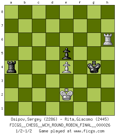 Last move : 1/2-1/2 2025 January 6 20:47:47 [Event "FICGS__CHESS__WCH_ROUND_ROBIN_FINAL__000026"] [Site "FICGS"] [Date "2024.10.01"] [Round "1"] [White "Osipov,Sergey"] [Black "Rita,Giacomo"] [Result "1/2-1/2"] [WhiteElo "2286"] [BlackElo "2445"] 1.e4 c5 2.Nf3 d6 3.Bb5+ Nd7 4.d4 cxd4 5.Qxd4 a6 6.Be2 Ngf6 7.O-O e5 8.Qe3 Nc5 9.Nfd2 Be7 10.c4 O-O 11.Nc3 Ng4 12.Bxg4 Bxg4 13.Nb3 Nd7 14.Qd3 Be6 15.Be3 Rc8 16.Nd2 g6 17.a4 f5 18.f3 Rf7 19.Bf2 Nf6 20.a5 Nh5 21.Bb6 Qf8 22.Be3 f4 23.Bf2 g5 24.Nd5 Nf6 25.Rac1 g4 26.Bh4 Qh6 27.Bxf6 Bxf6 28.fxg4 Bxg4 29.Nxf6+ Qxf6 30.Nf3 Kh8 31.b4 Rg8 32.Rc2 Rg6 33.c5 Bxf3 34.Rxf3 dxc5 35.bxc5 h6 36.Qc3 Rfg7 37.Rd3 Qh4 38.Rf2 Kh7 39.Rh3 Qe7 40.Rd3 Rg5 41.Rd5 Rh5 42.h3 Qe8 43.Rfd2 Qc8 44.Kh2 Qc6 45.Kg1 Qe8 46.c6 bxc6 47.Rd6 Rhg5 48.Rxc6 Rg3 49.Qc5 f3 50.Rxa6 Rxg2+ 51.Rxg2 Rxg2+ 52.Kh1 Qd8 53.Rd6 Qh4 54.Rd7+ Kg6 55.Qd6+ Qf6 56.Qxf6+ Kxf6 57.Rd3 Rg3 58.Kh2 Rg2+ 59.Kh1 Ra2 60.Rxf3+ Kg5 61.Rf5+ Kh4 62.Kg1 Kg3 63.Kf1 Rxa5 64.Ke2 Kxh3 65.Rh5+ Kg4 66.Rxh6 Ra2+ 67.Kd3 Ra3+ 68.Ke2 Ra4 69.Kd3 Ra3+ 70.Ke2 Ra4 71.Ke3 Ra3+ 72.Ke2 Ra4 1/2-1/2 Follow this game move after move (download)The beauty of a move lies not in its' appearance but in the thought behind it. (Siegbert Tarrasch) Bobby Fischer ist kein Vorbild für die heutige Jugend. (Viktor Kortschnoi) El Ajedrez demanda una total concentración. (Bobby Fischer) Tout change constamment, y compris dans le monde des Echecs. (Botvinnik) Perhaps the current trend of many chess professionals taking up the more lucrative pastime of poker is not a wholly negative one. It may not be too late for humans to relearn how to take risks in order to innovate and thereby maintain the advanced lifestyles we enjoy. And if it takes a poker-playing supercomputer to remind us that we can't enjoy the rewards without taking the risks, so be it. (The Chess Master and the Computer, by Garry Kasparov - 2010)