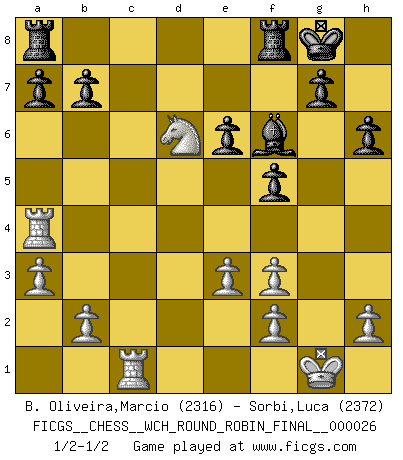 Last move : 1/2-1/2 2024 November 6 16:16:41 [Event "FICGS__CHESS__WCH_ROUND_ROBIN_FINAL__000026"] [Site "FICGS"] [Date "2024.10.01"] [Round "1"] [White "B. Oliveira,Marcio"] [Black "Sorbi,Luca"] [Result "1/2-1/2"] [WhiteElo "2316"] [BlackElo "2372"] 1.d4 Nf6 2.c4 e6 3.Nf3 d5 4.Nc3 Bb4 5.Bg5 h6 6.Bxf6 Qxf6 7.e3 O-O 8.Rc1 dxc4 9.Bxc4 c5 10.O-O cxd4 11.Ne4 Qe7 12.Nxd4 Bd7 13.Be2 Nc6 14.a3 Nxd4 15.Qxd4 Ba5 16.Qc5 Bd8 17.Rfd1 Ba4 18.Rd4 Bc6 19.Bf3 f5 20.Qxe7 Bxe7 21.Nd6 Bxf3 22.gxf3 Bf6 23.Ra4 1/2-1/2 Follow this game move after move (download)Chess is really ninety nine percent calculation. (Soltis) Das typische an einem Großmeister ist, daß er eine gewonnene Position schnell und schmerzlos gewinnt. (Irving Chernev) Aquellos que dicen que entienden al Ajedrez, no entienden nada. (Robert Hubner) La solitude du joueur d'Echecs à l'approche du mat est semblable à celle du condamné. (Francis Szpiner) The meaning of life is that it is to be lived, and it is not to be traded and conceptualized and squeezed into a pattern of systems. (Bruce Lee)