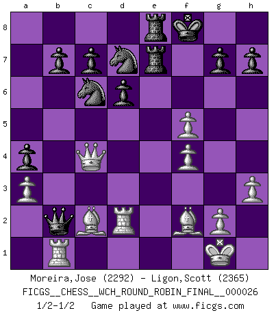 Last move : 1/2-1/2 2024 October 6 20:57:18 [Event "FICGS__CHESS__WCH_ROUND_ROBIN_FINAL__000026"] [Site "FICGS"] [Date "2024.10.01"] [Round "1"] [White "Moreira,Jose"] [Black "Ligon,Scott"] [Result "1/2-1/2"] [WhiteElo "2292"] [BlackElo "2365"] 1.d4 Nf6 2.c4 e5 3.dxe5 Ng4 4.e4 Nxe5 5.f4 Nec6 6.Nc3 Bc5 7.Na4 Qe7 8.Nxc5 Qxc5 9.a3 O-O 10.Bd3 a5 11.Qf3 Qb6 12.Ne2 d6 13.Be3 Qb3 14.Rd1 Be6 15.Rd2 Bxc4 16.Bb1 Bxe2 17.Qxe2 Nd7 18.O-O Rfe8 19.h3 a4 20.Re1 f5 21.exf5 Re7 22.Bc2 Qxb2 23.Qc4+ Kf8 24.Rb1 Qf6 25.Bf2 Rae8 26.Rbd1 Qb2 27.Rb1 Qf6 28.Rbd1 Qb2 29.Rb1 1/2-1/2 Follow this game move after move (download)You need not play well - just help your opponent to play badly. (Genrikh Chepukaitis) Ich hatte meine größten Erfolge, als ich 47 Jahre alt war. Kasparow war noch nicht mal 42 und hat das Schach schon im Stich gelassen. (Viktor Kortschnoi) El Ajedrez detiene a su maestro dentro de sus propios vínculos, encadenando la mente y el cerebro, por lo que la libertad interior del mas fuerte debe sufrir. (Albert Einstein) Le génie consiste à savoir transgresser les règles au moment opportun. (Teichmann) The various flowers seem good to different people. (Chinese proverb)