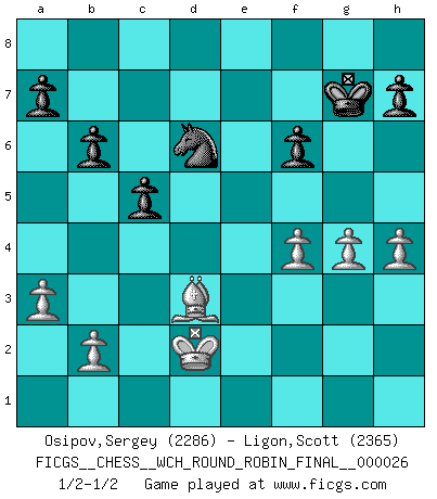 Last move : 1/2-1/2 2024 October 26 9:20:7 [Event "FICGS__CHESS__WCH_ROUND_ROBIN_FINAL__000026"] [Site "FICGS"] [Date "2024.10.01"] [Round "1"] [White "Osipov,Sergey"] [Black "Ligon,Scott"] [Result "1/2-1/2"] [WhiteElo "2286"] [BlackElo "2365"] 1.d4 Nf6 2.c4 e5 3.dxe5 Ng4 4.e4 Nxe5 5.Nc3 Bc5 6.f4 Nec6 7.Na4 Qe7 8.Nxc5 Qxc5 9.Ne2 d6 10.Nc3 Be6 11.a3 O-O 12.Qd3 f5 13.Be3 fxe4 14.Qxe4 Qf5 15.Qxf5 Bxf5 16.c5 dxc5 17.Bc4+ Kh8 18.Bxc5 Re8+ 19.Kf2 Nd7 20.Be3 Na5 21.Ba2 Nf6 22.Bd4 Be6 23.Bxf6 gxf6 24.Nd5 Bxd5 25.Bxd5 c6 26.Ba2 Re4 27.g3 Rae8 28.Rhe1 Rxe1 29.Rxe1 Rxe1 30.Kxe1 b6 31.g4 Nb7 32.Bb1 Nd6 33.Bd3 c5 34.h4 Kg7 35.Kd2 1/2-1/2 Follow this game move after move (download)Winning isn't everything... but losing is nothing. (Mednis) Das ganze Leben mit einer Ehefrau ist wie ein Endspiel mit ungleichfarbigen Läufern. (Viktor Kortschnoi) Dios mío, Bobby Fischer juega tan simple. (Alexei Suetin) Psychologiquement, tu dois avoir confiance en toi même, mais cette confiance doit être basée sur des faits. (Robert Fischer) To be champion requires more than simply being a strong player; one has to be a strong human being as well. (Anatoly Karpov)
