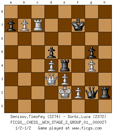 Last move : 1/2-1/2 2024 December 4 9:19:28 [Event "FICGS__CHESS__WCH_STAGE_2_GROUP_01__000027"] [Site "FICGS"] [Date "2024.10.01"] [Round "1"] [White "Denisov,Timofey"] [Black "Sorbi,Luca"] [Result "1/2-1/2"] [WhiteElo "2274"] [BlackElo "2372"] 1.d4 Nf6 2.c4 e6 3.Nf3 d5 4.Nc3 Bb4 5.cxd5 exd5 6.Bg5 h6 7.Bh4 O-O 8.e3 Bf5 9.Qb3 Bxc3+ 10.Qxc3 g5 11.Bg3 Ne4 12.Qa3 Re8 13.Rc1 Nd7 14.Bd3 c6 15.Nd2 Nxg3 16.hxg3 Bxd3 17.Qxd3 Re6 18.g4 Qb6 19.Rc2 Rae8 20.Nf1 Qa5+ 21.Ke2 Qxa2 22.Ng3 Nf6 23.Rxh6 Ne4 24.Rh3 Nxg3+ 25.Rxg3 Rh6 26.Rf3 Re4 27.Rf5 f6 28.b4 Qa1 29.b5 Rh1 30.Kf3 Qg1 31.Rxf6 Rh2 32.Ke2 Rh1 33.Kf3 Rh2 34.bxc6 Kg7 35.Ke2 Rh1 36.Kf3 Rh2 37.cxb7 Qxg2+ 38.Ke2 Kxf6 39.Rc6+ Kf7 40.Rc7+ 1/2-1/2 Follow this game move after move (download)Bobby Fischer's current state of mind is indeed a tragedy. One of the world's greatest Chess players - the pride and sorrow of American Chess. (Frank Brady) Je älter ich werde, um so mehr schätze ich die Bauern. (Paul Keres) Aquellos que dicen entender al Ajedrez, no entienden nada. (Robert Hubner) Si je n'étais pas joueur d'échecs, je serais le meilleur dans quelque chose d'autre. (Anatoli Karpov) The Internet is the first thing that humanity has build that humanity doesn't understand, the largest experiment in anarchy that we have ever had. (Eric Schmidt)