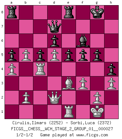 Last move : 1/2-1/2 2024 October 8 18:12:20 [Event "FICGS__CHESS__WCH_STAGE_2_GROUP_01__000027"] [Site "FICGS"] [Date "2024.10.01"] [Round "1"] [White "Cirulis,Ilmars"] [Black "Sorbi,Luca"] [Result "1/2-1/2"] [WhiteElo "2252"] [BlackElo "2372"] 1.e4 c5 2.Nf3 d6 3.d4 cxd4 4.Nxd4 Nf6 5.Nc3 a6 6.f3 e5 7.Nb3 Be6 8.Be3 Be7 9.Qd2 h5 10.Nd5 Nxd5 11.exd5 Bf5 12.Be2 a5 13.a4 O-O 14.O-O Nd7 15.h3 Nf6 16.Bb5 Bd7 17.c4 Re8 18.Rfc1 h4 19.Rd1 b6 20.Nc1 Bxb5 21.cxb5 Nd7 22.Nd3 Nc5 23.Nxc5 bxc5 24.Rac1 f5 25.Rc4 Bf6 26.Re1 Qd7 27.Bf2 g5 28.Be3 1/2-1/2 Follow this game move after move (download)When you see a good move, look for a better one. (Emanuel Lasker) Wer wird heute Abend ihr Gegner sein? -- Heute Abend spiele ich gegen die schwarzen Steine. (Akiba Rubinstein) Todos los jugadores de Ajedrez deberían tener un pasatiempo. (Savielly Tartakower) Une platitude souvent récitée à propos des Echecs est qu'une des choses les plus difficiles à réaliser est de gagner une position gagnante. Cela ne manque pas de sens mais, pour ma part, j'ai toujours trouvé plus difficile de gagner une position perdante. (Tim Krabbe) Now be brave and don't look back. Don't look back. (Shmi Skywalker in Star Wars ep.1)