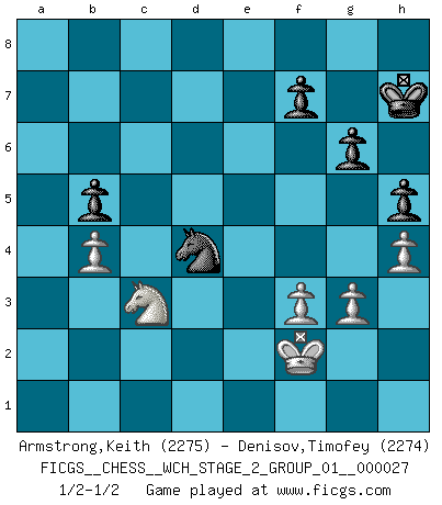 Last move : 1/2-1/2 2024 December 27 22:35:39 [Event "FICGS__CHESS__WCH_STAGE_2_GROUP_01__000027"] [Site "FICGS"] [Date "2024.10.01"] [Round "1"] [White "Armstrong,Keith"] [Black "Denisov,Timofey"] [Result "1/2-1/2"] [WhiteElo "2275"] [BlackElo "2274"] 1.Nf3 d5 2.d4 Nf6 3.c4 c6 4.e3 e6 5.Nbd2 Nbd7 6.b3 Bd6 7.Bb2 O-O 8.Qc2 c5 9.dxc5 Nxc5 10.Be2 b6 11.Rd1 Qe7 12.Ng5 Ncd7 13.cxd5 exd5 14.O-O Bb7 15.Qb1 Rac8 16.Qa1 Be5 17.Ngf3 Bxb2 18.Qxb2 Ne4 19.Rc1 a5 20.Nd4 g6 21.h3 h5 22.Bb5 Nd6 23.Be2 Ne4 24.N2f3 Rxc1 25.Rxc1 Rc8 26.Rxc8+ Bxc8 27.Bb5 Qc5 28.Bxd7 Bxd7 29.Ne2 Bb5 30.Nf4 Qc3 31.Qb1 Bc6 32.Ne2 Qc5 33.Nfd4 Bb5 34.Nf4 Ba6 35.h4 Bb7 36.Qd1 Qc3 37.Nfe2 Qb4 38.Qc1 Qe7 39.g3 Qc5 40.Kg2 Ba6 41.Qb2 a4 42.f3 Bxe2 43.Nxe2 Nd6 44.Kf2 Nf5 45.Qe5 axb3 46.axb3 Kh7 47.Qc3 Qxc3 48.Nxc3 d4 49.exd4 Nxd4 50.b4 b5 1/2-1/2 Follow this game move after move (download)You cannot play at Chess if you are kind-hearted. (French Proverb) Korrekt heißt in Deutschland die Haltung eines Mannes, dessen Benehmen nach dem Urteile seiner Nachbarn seiner Stellung angemessen ist. Um korrekt zu sein, muß man sich der Meinung der anderen anpassen... (Emanuel Lasker) Con o sin el título, Bobby Fischer fue sin lugar a dudas el mas grande jugador de su época. (Burt Hochberg) Des idées, des idées, j'en ai cent, j'en ai mille. Des bonnes, des mauvaises, applicables, irréalisables... Il suffit de faire le tri ! (Roos) Whatever you do, don't be bored. This is absolutely the most exciting time we could have possibly hoped to be alive. And things are just starting. (From movie Waking life)