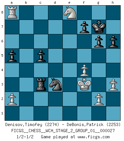 Last move : 1/2-1/2 2025 February 28 9:52:59 [Event "FICGS__CHESS__WCH_STAGE_2_GROUP_01__000027"] [Site "FICGS"] [Date "2024.10.01"] [Round "1"] [White "Denisov,Timofey"] [Black "DeBonis,Patrick"] [Result "1/2-1/2"] [WhiteElo "2274"] [BlackElo "2253"] 1.e4 e5 2.Nf3 Nc6 3.Bb5 Nf6 4.d3 Bc5 5.c3 O-O 6.O-O d5 7.exd5 Qxd5 8.Bc4 Qd8 9.Nbd2 a5 10.h3 h6 11.Re1 Qd6 12.Nf1 Rd8 13.Be3 Bf5 14.Qa4 Bg6 15.Bxc5 Qxc5 16.Qb5 Qxb5 17.Bxb5 e4 18.Bxc6 exf3 19.Bxf3 Bxd3 20.Re7 Rd7 21.Rxd7 Nxd7 22.Rd1 Ne5 23.Bxb7 Rb8 24.Bd5 Rxb2 25.f4 Be2 26.Rd4 Rb1 27.Kf2 Bb5 28.Ne3 Nd3+ 29.Kf3 c5 30.Re4 Kf8 31.Bc4 Bxc4 32.Nxc4 Rc1 33.Nd6 g6 34.Re8+ Kg7 35.Ra8 Rxc3 36.Ra7 Kg8 37.Ra8+ Kg7 38.Ne8+ Kf8 39.Nf6 Kg7 40.Ne8+ 1/2-1/2 Follow this game move after move (download)The laws of Chess do not permit a free choice: you have to move whether you like it or not. (Emanuel Lasker) Moralische Siege zählen nicht. (Savielly Grigorievitsch Tartakower) El hombre es un frívolo, una creatura engañosa y como un jugador de Ajedrez, se preocupa mas por el proceso de obtener su meta que de la meta por sí misma. (Dostoyevsky) Le génie consiste à savoir transgresser les règles au moment opportun. (Teichmann) Once you start thinking you have nothing left to learn, you have everything to learn. (Steve Badget)