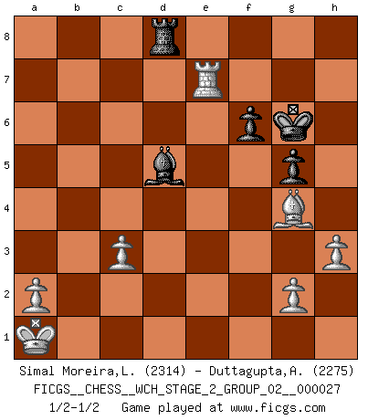 Last move : 1/2-1/2 2025 January 24 19:1:3 [Event "FICGS__CHESS__WCH_STAGE_2_GROUP_02__000027"] [Site "FICGS"] [Date "2024.10.01"] [Round "1"] [White "Simal Moreira,Leonardo"] [Black "Duttagupta,Aniruddha"] [Result "1/2-1/2"] [WhiteElo "2314"] [BlackElo "2275"] 1.d4 d5 2.c4 c6 3.Nf3 Nf6 4.Nc3 e6 5.Bg5 h6 6.Bh4 dxc4 7.e4 g5 8.Bg3 b5 9.Be2 Bb7 10.Ne5 Nbd7 11.Qc2 Nxe5 12.Bxe5 Bb4 13.f4 Rg8 14.O-O-O Bxc3 15.Qxc3 Nxe4 16.Qc2 Nf2 17.f5 Qd7 18.Bh5 Nxh1 19.fxe6 Qxe6 20.Rxh1 c5 21.Qh7 Rf8 22.h3 Rd8 23.Re1 Rxd4 24.Re3 Rd3 25.Re2 Qd5 26.Re1 Bc8 27.Qxh6 Qe6 28.Qh7 Bd7 29.Qg7 Qe7 30.Qh6 c3 31.bxc3 c4 32.Qa6 Rg8 33.Qxa7 Be6 34.Qb6 Kf8 35.Bd4 Rxd4 36.Qxd4 Qa3+ 37.Kb1 Bf5+ 38.Ka1 b4 39.Qc5+ Kg7 40.Qxb4 Qa7 41.Qxc4 Rd8 42.Qe2 Be6 43.Bg4 Bd5 44.Qe5+ f6 45.Qe7+ Qxe7 46.Rxe7+ Kg6 1/2-1/2 Follow this game move after move (download)I am still a victim of Chess. It has all the beauty of art and much more. It cannot be commercialized. Chess is much purer than art in its social position. (Marcel Duchamp) Offensichtlich kennt Kasparow nichts anderes als Schach, und ich könnte 500 weitere Spieler dieser Sorte benennen. (Judith Polgar) Con o sin el título, Bobby Fischer fue sin lugar a dudas el mas grande jugador de su época. (Burt Hochberg) Mon pion favori sur ma case favorite ! Bronstein en parlant d'un coup de pion en h5 quand il avait les Noirs. Creativity is allowing yourself to make mistakes. Art is knowing which ones to keep. (Scott Adams)